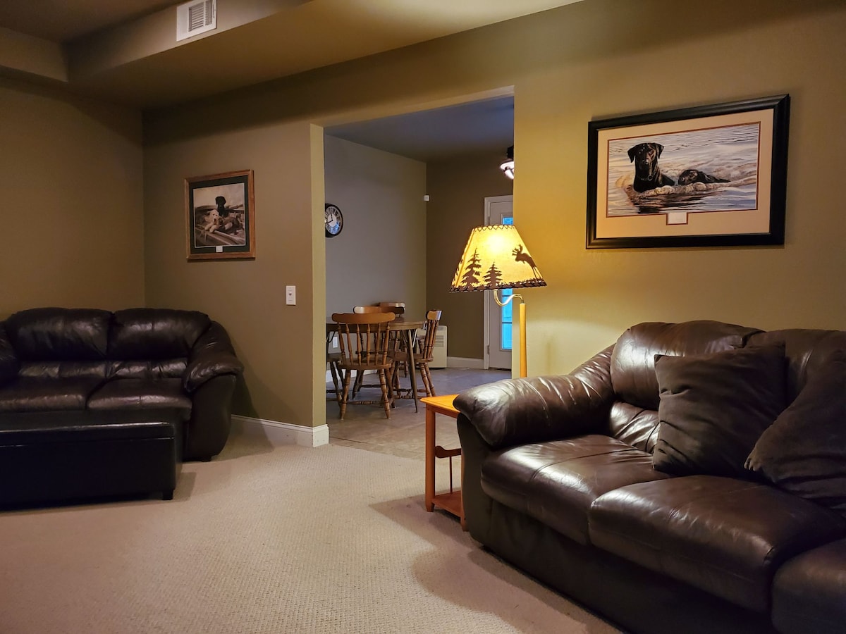 Si vous cherchez à faire une pause et à passer du temps à la campagne, cette location est pour vous. Ce logement est le niveau inférieur entièrement meublé et accessible de plain-pied de notre maison. Il dispose d'une entrée privée, d'un lit King Size, d'une salle de bain complète avec baignoire, d'une cuisine, d'un coin repas et d'un espace de divertissement spacieux. Il y a beaucoup de place pour un matelas gonflable dans le séjour (matelas gonflable non fourni). Comme nous vivons au-dessus de cette propriété, absolument aucun animal de compagnie, aucun tabagisme et aucun voyageur non enregistré.