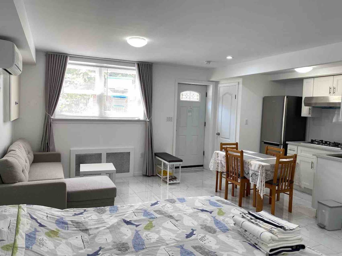 Profitez d'un séjour confortable dans notre espace récemment rénové et meublé avec soin à quelques minutes de l'aéroport LaGuardia. Cet appartement comprend une cuisine à aire ouverte et un salon avec un canapé, équipé de l'essentiel et d'une télévision pour votre détente. Idéal pour les voyageurs ayant besoin d'un accès rapide à Manhattan et au Queens, avec des lignes de bus Q33 et Q19 à proximité pour un transport facile vers les stations de métro et Flushing. Parfait pour une escale reposante ou une aventure prolongée à New York !