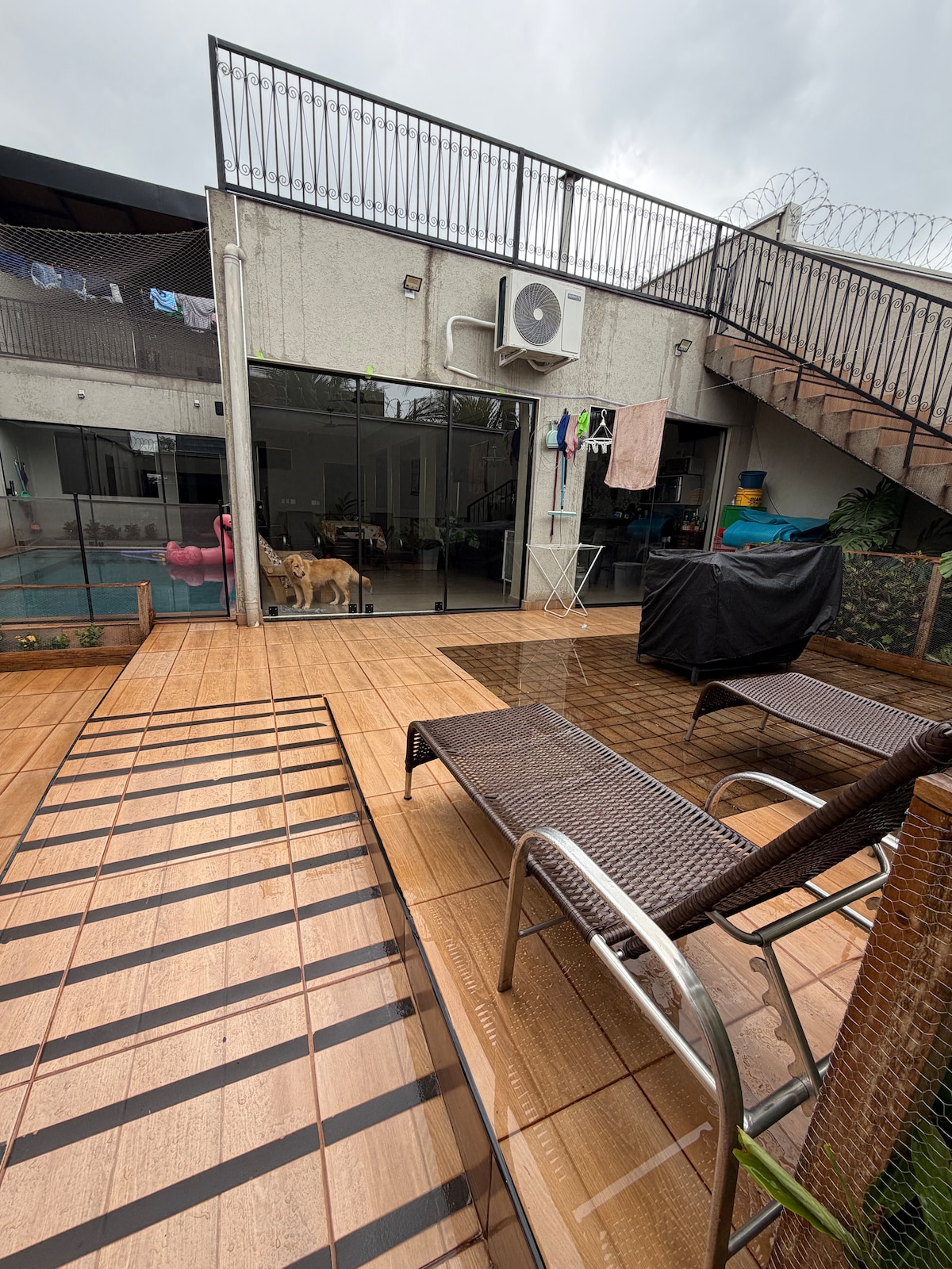 Zone de loisirs familiale (Disponible pour Agrishow) Logement disponible pour 50 personnes. District Lazer Space avec piscine, cuisine, barbecue, 3 salles de bain 1 chambre avec 2 lits superposés, 1 matelas double 1 carte, 1 réfrigérateur, 1 cuisinière, 1 four électrique, 6 jeux de table, environnement sonore, table de billard, WI-FI, 2 télévision, 1 projecteur et garage pour deux voitures. Autres remarques Nous n'offrons pas de linge de lit et de bain.