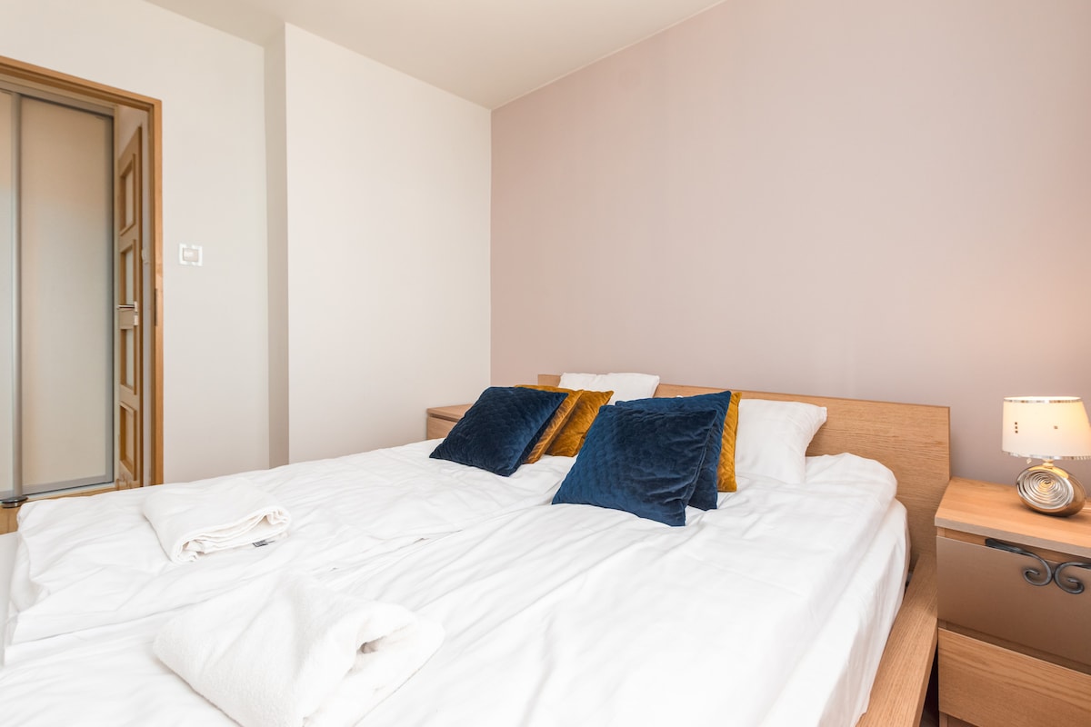 Appartement confortable et entièrement équipé dans un immeuble neuf. Salon avec cuisine ouverte divisé en salle à manger et salon. La chambre dispose d'un grand lit et d'une armoire spacieuse. Il y a aussi un dressing comme espace de rangement supplémentaire. Il y a des magasins, des restaurants et des cafés à proximité Équipement : climatisé, cafetière, bouilloire, fer et planche à repasser, machine à laver Accès depuis l'aéroport Chopin 20 min en taxi 50 min en transports en commun depuis l'aéroport de Modlin 50 min en taxi 120 min en transports en commun