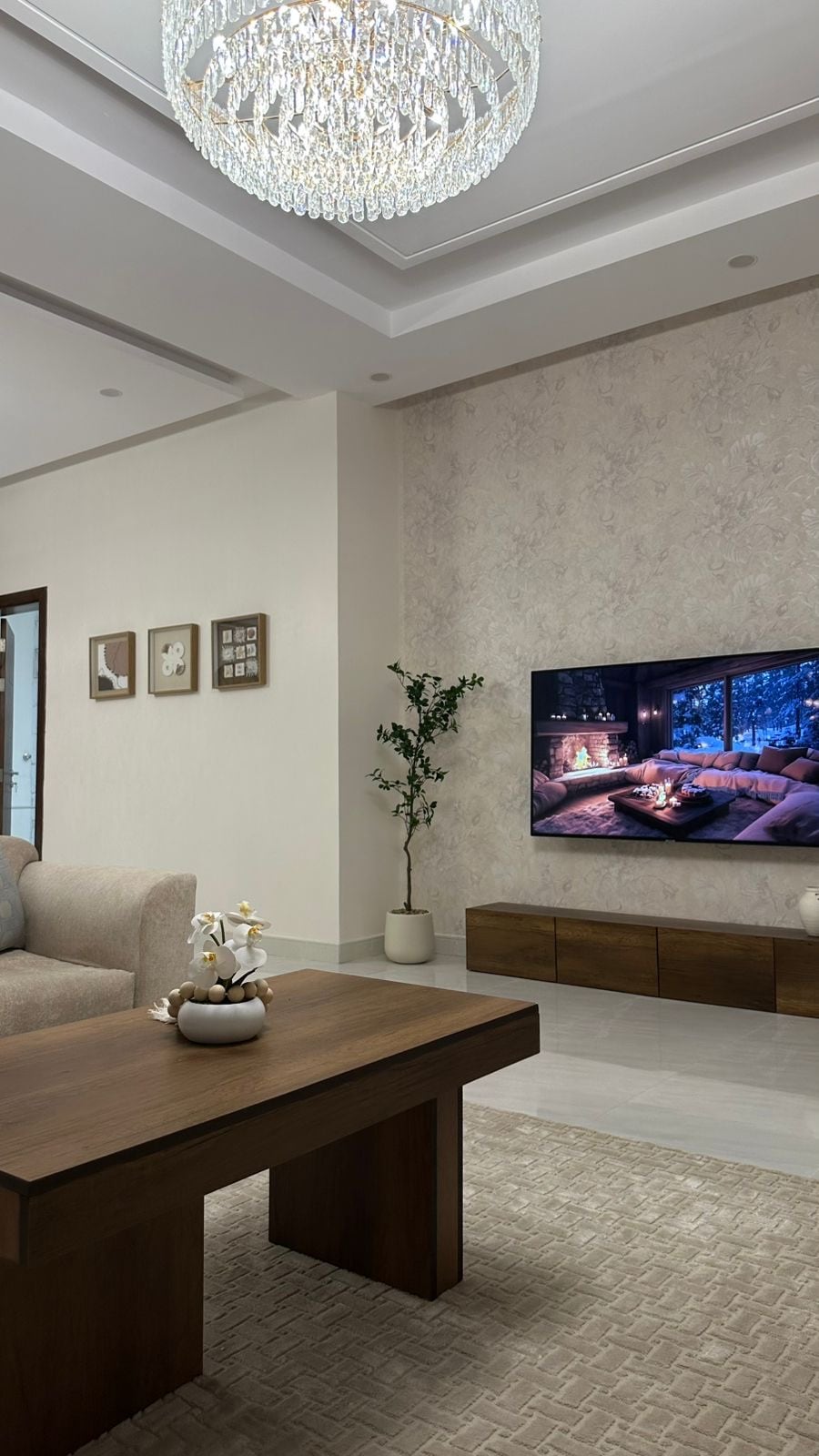 Télévision connectée scandinave 65 pouces, réfrigérateur, bouilloire, coin café