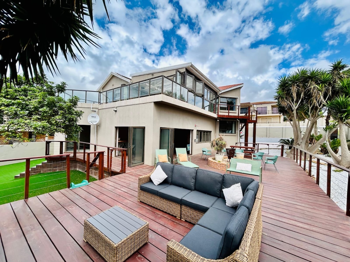 Maison spacieuse de 3 étages avec vue imprenable sur la mer. Avec : 5 chambres avec salle de bains privative, chacune avec sa propre télévision et son propre climatiseur. 2 salons, 1 avec un coin bibliothèque et l'autre avec une télévision et un système de divertissement Bluetooth menant à une grande cuisine équipée, un coin repas intérieur et extérieur avec barbecue/braai. Chaque balcon avec vue sur la mer dispose de 2 chaises longues et d'un coin salon. Parking sécurisé avec télécommandes. Système de secours en place pour la réduction de charge.