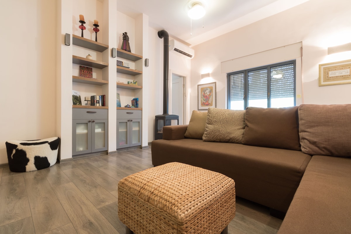 Un logement spacieux adapté aux familles, avec beaucoup d'espace pour passer du temps ensemble. La maison est construite sur deux étages, un total de 160 mètres carrés. La maison dispose de trois chambres + un espace de couchage ouvert (préféré par tout le monde...), une salle de sécurité, une cuisine entièrement équipée et agréable, un barbecue, un belvédère amusant en été, un accès direct au lac Beit Zait (2 minutes à pied). La maison borde un wadi et est entourée par la nature, de sorte que vous pouvez aller vous promener directement à partir de la maison. Il y a un beau poulailler, un foyer au bois en hiver, un grand et spacieux jardin plein d'arbres fruitiers. En voiture, vous pouvez rejoindre le centre de Jérusalem en 10-15 minutes sans embouteillages. Il y a des transports en commun toutes les heures.