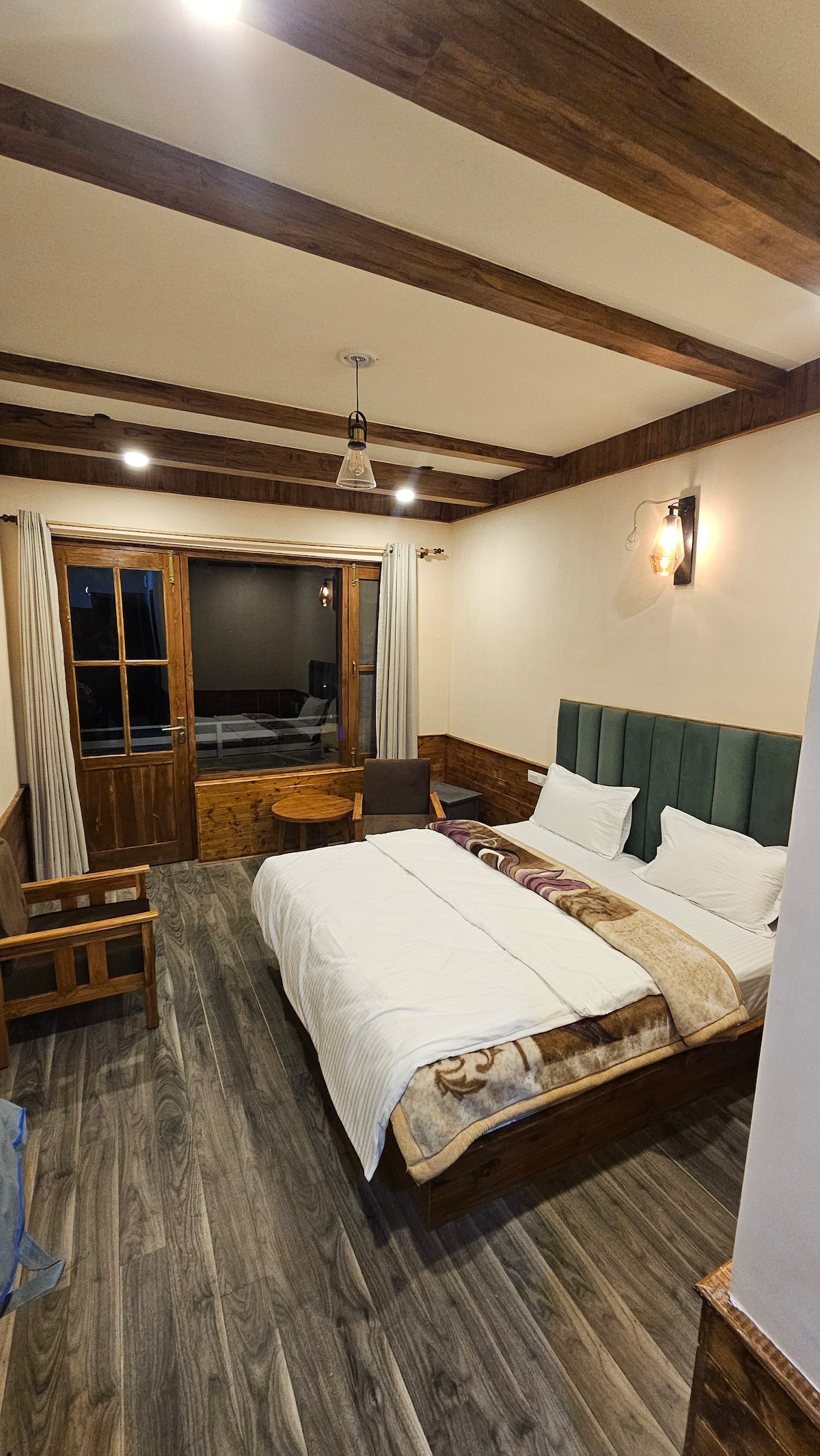 A cozy boutique mountain room wrapped in warm wood interiors and floor-to-ceiling views of the Himalayas. Wake up to sunlight, sip your coffee by the window, and unwind in a peaceful, stylish space designed for comfort and relaxation. Perfect for couples and travelers looking for a serene stay near Manali. This stylish and unique place sets the stage for a memorable trip.