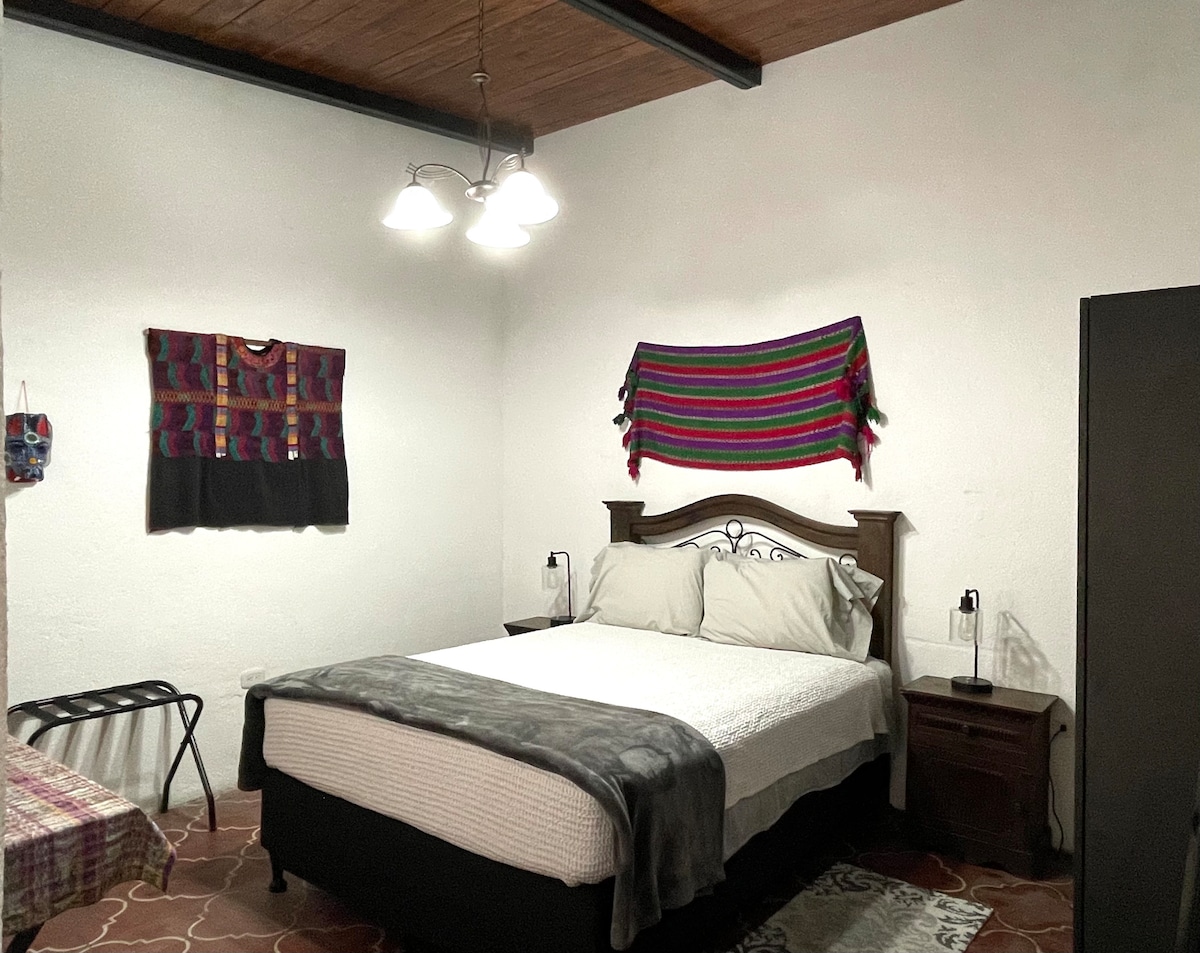Vive la experiencia de hospedarte en el corazón de La Antigua Guatemala. A solo unas cuadras del parque, recorre estas mágicas calles a pie. Con muchos restaurantes, bares y atrcciones a solamente unos pasos pero lo suficiente como para mantenernos privados del ruido nocturno. Es un espacio acogedor diseñado para 2 personas, con todo lo necesario para estadías largas y cortas en un vecindario precioso y súper seguro. No contamos con parqueo privado y debes de subir unas gradas al llegar.