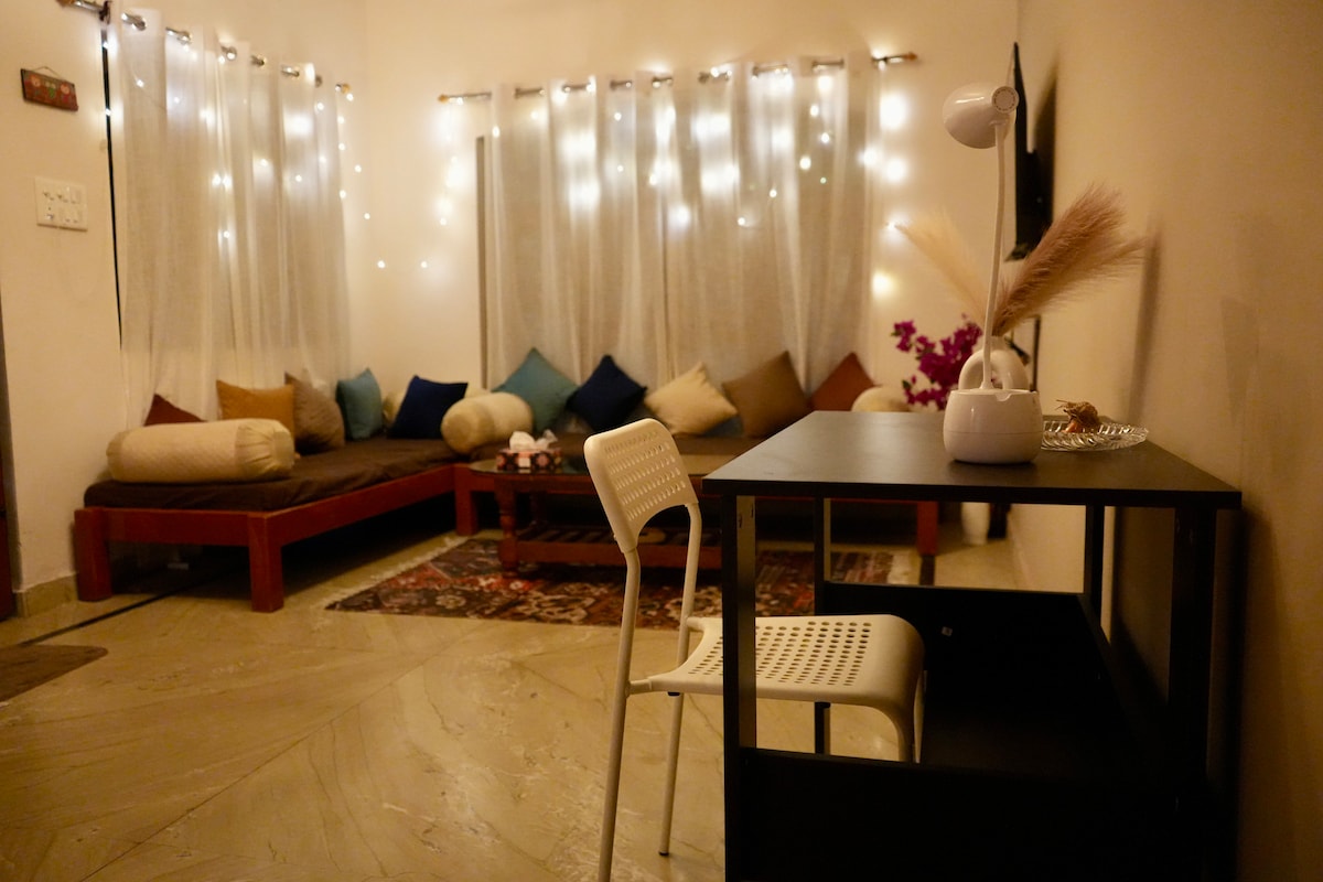 « Saadagi » : Spacieux et minimaliste sur le thème du Japandi 1BHK à Upper Tapovan, créé avec amour par notre mère de 62 ans qui a versé son cœur dans chaque détail. Salon serein avec canapé-lit, alimentation 24h/24 et 7j/7, Wi-Fi, cuisine entièrement meublée, chambre confortable avec bureau, climatisation, lave-linge et réfrigérateur. Prenez du café au lever du soleil sur le bureau pliant du balcon et des tabourets de perchoir ou profitez d'une vue panoramique depuis la terrasse partagée. À proximité des meilleures écoles de yoga et des cafés, ce havre de paix convient aux retraites courtes et aux séjours prolongés.