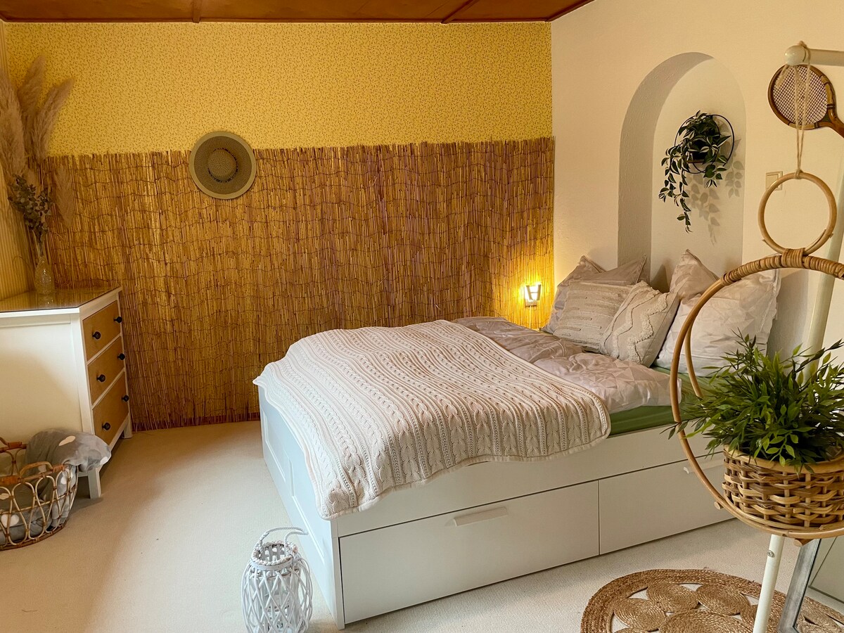 Mon appartement d'hôtes offre 45 m2 d'espace pour 2-4 personnes. Il est confortablement meublé et moderne et invite à la détente - c'est ce que disent mes clients :-). Après une longue journée d'excursion, la chambre à coucher séparée permet de se retirer un peu. L'appartement dispose également d'une kitchenette privée et d'une salle de douche. Pour plus de deux personnes, le canapé-lit peut être converti en lit double.