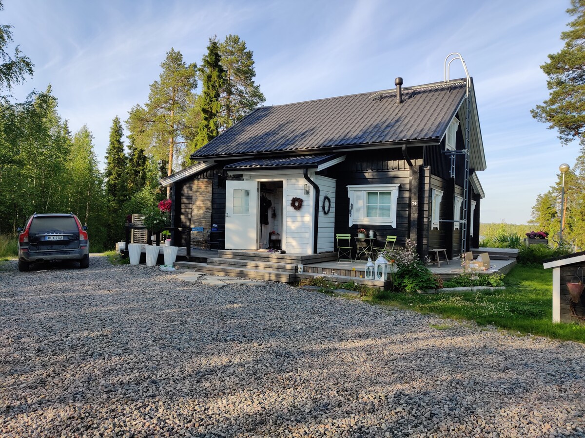 Bienvenue dans notre charmant chalet.Un design intérieur chaleureux, un sauna au feu de bois agréable, des équipements modernes et une terrasse vitrée rendront votre séjour agréable et mémorable.Le paysage forestier qui s'offre à la vue depuis les grandes fenêtres invite à la détente près de la cheminée et à admirer le ciel étoilé et les aurores boréales dans l'obscurité.Les sentiers de randonnée de Korouoma et ses cascades de glace hivernales ne sont qu'à 5 kilomètres – une destination idéale pour les randonneurs, les grimpeurs sur glace et les amoureux de la nature tout au long de l'année.