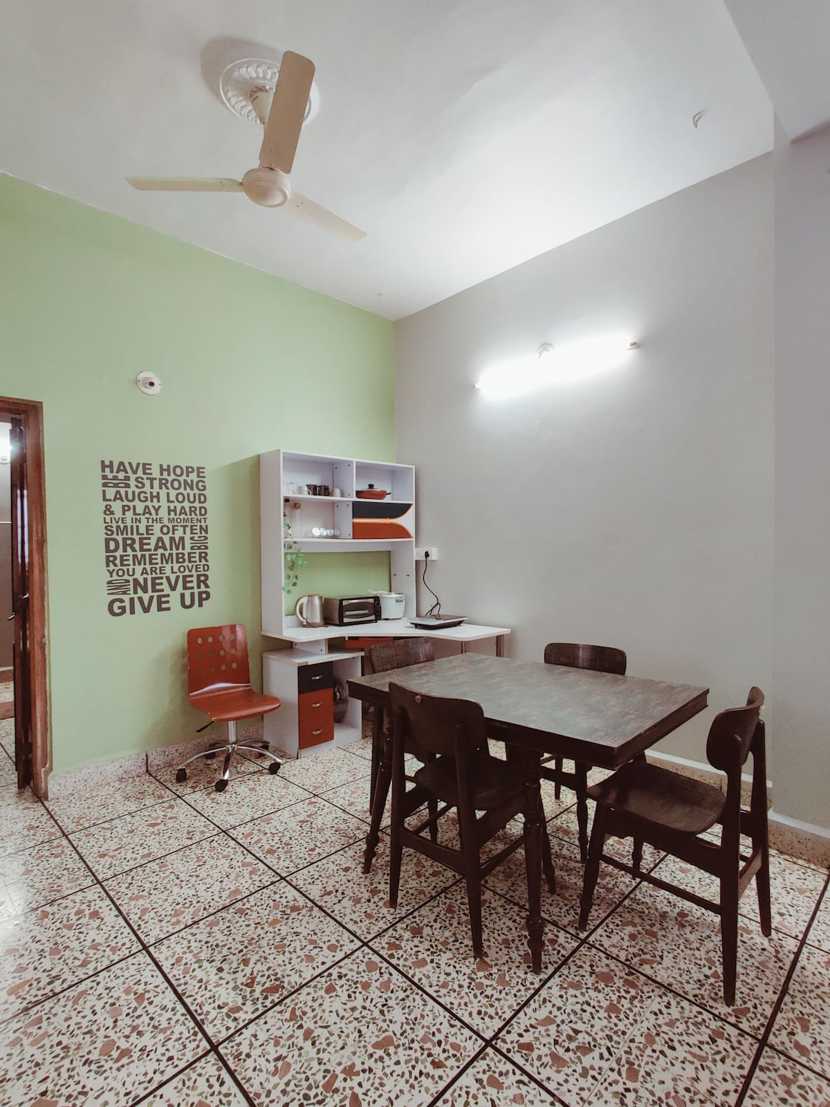 Cette maison d'hôtes confortable de 2 chambres à Hospet est votre retraite idéale. Il est idéalement situé à proximité de la gare, de l'arrêt de bus et des principales attractions comme Hampi et le barrage de Tungabhadra. La maison d'hôtes est au 1er étage, offre deux chambres bien aménagées, un salon spacieux, une cuisine, une connexion Wi-Fi et une terrasse. Vous trouverez des magasins essentiels, des pharmacies et des restaurants locaux à proximité, ainsi que la commodité de la livraison Zomato. Il y a des places pour garer les véhicules. Le règlement intérieur garantit un séjour paisible.