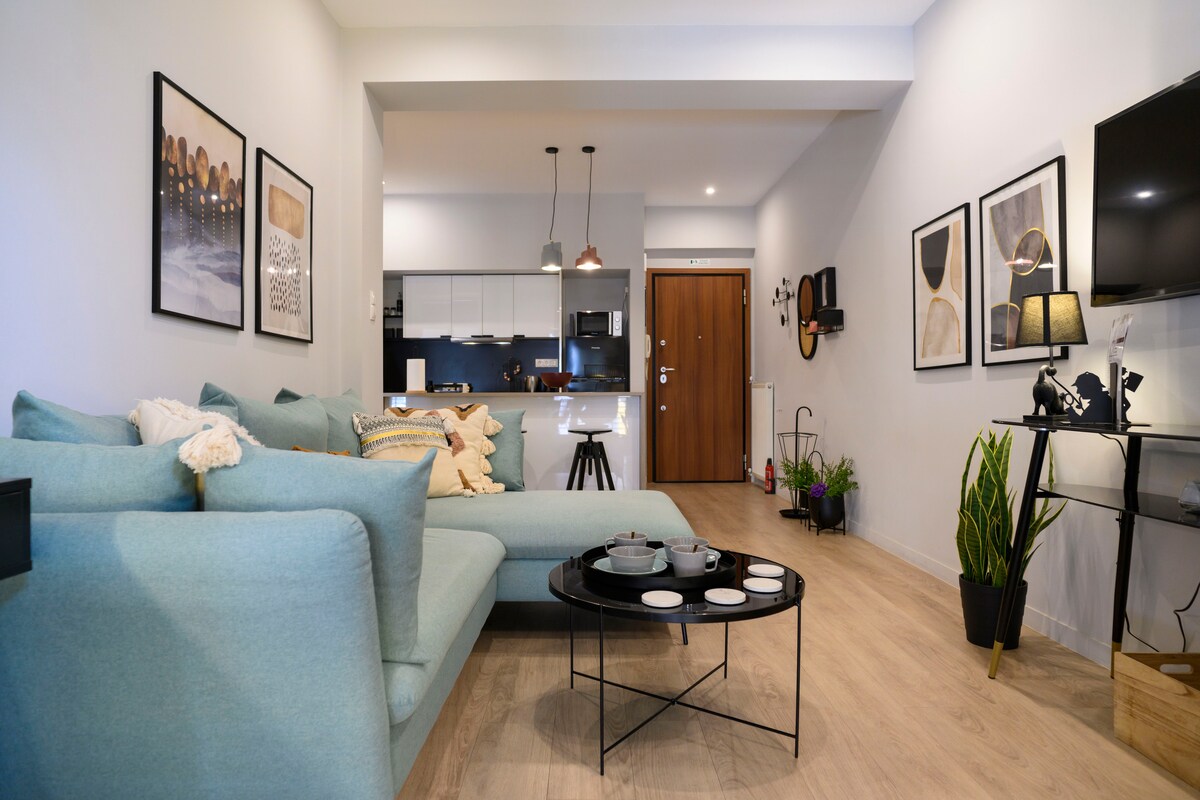 Profitez d'une expérience élégante dans ce condo central construit en 2021, avec piscine partagée. À seulement 12 minutes de l'Acropole (4 km) et de la place Syntagma (4,5 km). À 10-15 minutes de la plage de Bolivar (10 km) et du port du Pirée (6,7 km). À proximité des marchés, des magasins et des restaurants. La ligne verte du métro, le bus et le taxi sont à quelques minutes. Grand lit King size avec matelas confortable et canapé-lit confortable. Appartement entièrement équipé, avec un grand balcon et une télévision de 65'. Réservez vos voyages avec moi.