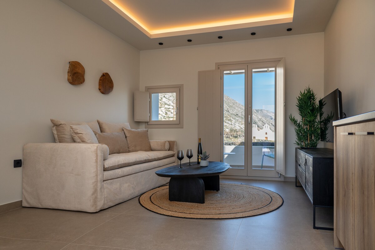 Une toute nouvelle suite élégante se compose d'une chambre, d'une salle de bain, d'une cuisine et d'un coin salon confortable. Il offre une grande terrasse avec un jacuzzi privé et une vue imprenable sur la mer Égée. Idéal pour les couples et les jeunes mariés offrant des moments romantiques inoubliables. Situé à quelques mètres du centre d'Emporio où vous trouverez des marchés, une gare routière, des lieux locaux pour le café et la nourriture,et le Kasteli historique d'Emporio. Les célèbres plages noires de Perivolos et Perissa sont à 5 minutes en voiture.