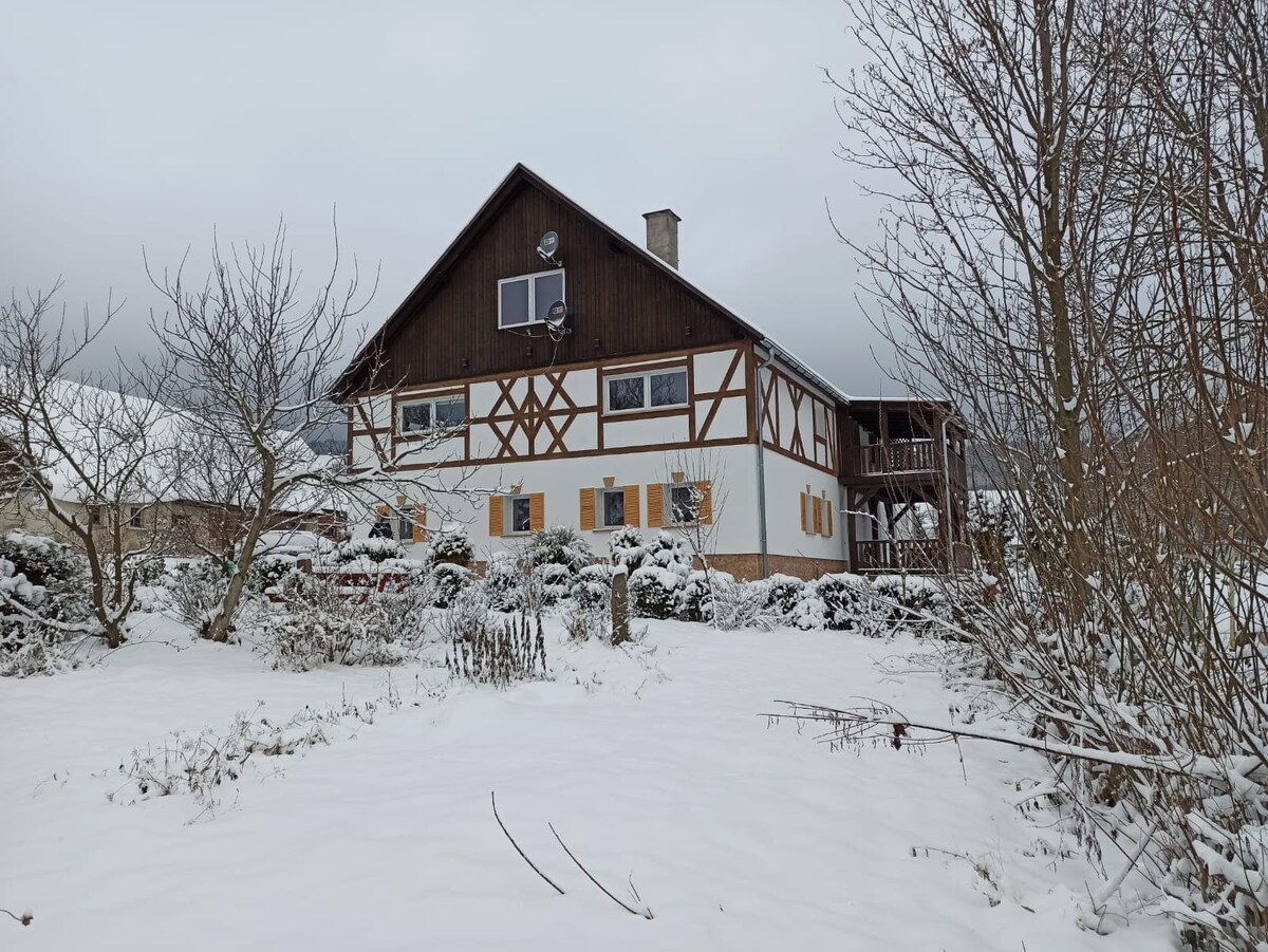 Une maison pour 8 personnes dans le village climatique de Leszczyniec dans les Sudètes de l'Ouest. Un logement avec un foyer et un grand patio couvert. À l'extérieur, il y a un spa chauffé (en option - frais supplémentaires) et une aire de jeux. L'endroit idéal pour les promenades dans les bois (près des sentiers), le vélo, le travail calme et éloigné, les vacances d'hiver et les vacances d'été. Il y a un foyer extérieur. Internet LTE (WiFi) pour les voyageurs inclus. Proche des pistes de ski en République tchèque (Mala Upa, Pec pod Śnieżkou) et du ski de Czarnów - à 5 minutes.