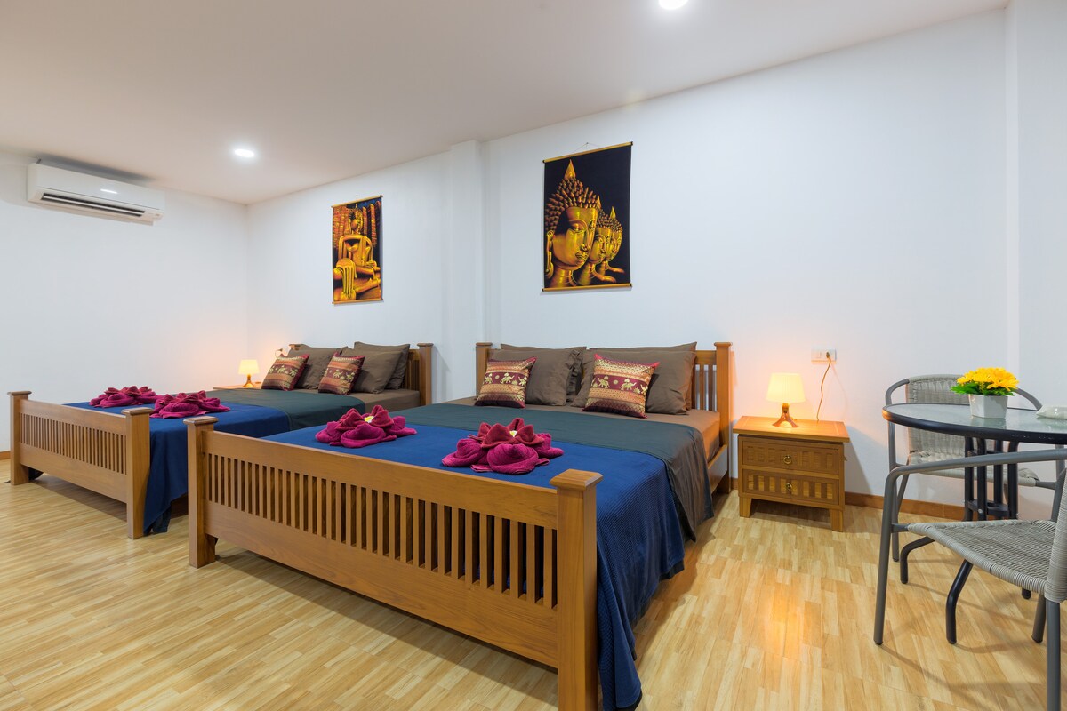 Very spacious room in quiet area just 1 minute from the beach.Air con room 40sqm,we can host 5 guests,1 king size bed,3 single beds,private bathroom,A/C,hot shower,wifi,fridge,kettle,coffee,water,hairdryer etc.... Daily cleaning.