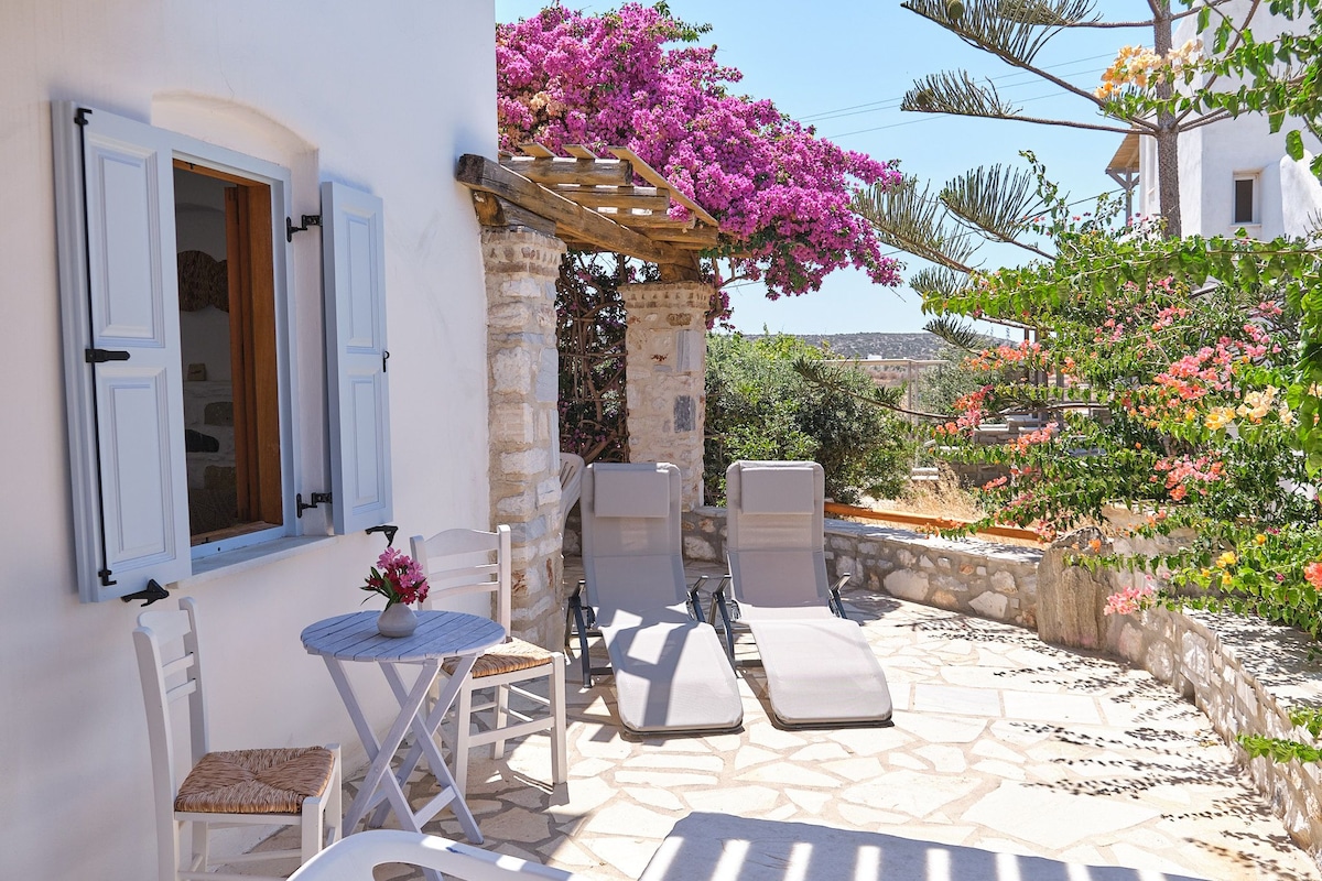 Appartement dans une vraie maison cycladique, situé dans un hameau paisible à 400 m de la mer. Récemment rénové, il offre toutes les commodités dont ; grande terrasse, barbecue, jardin fleuri, volets, moustiquaires, climatisation, lave vaisselle, ect,... A votre disposition tout proche, un mini market, plage, spot de kitesurf, plongée,... Situé à 5 km du village typique d'Aliki et ses restaurants et commerces. Proche de l'aéroport de Paros mais pas dans la ligne de vol...