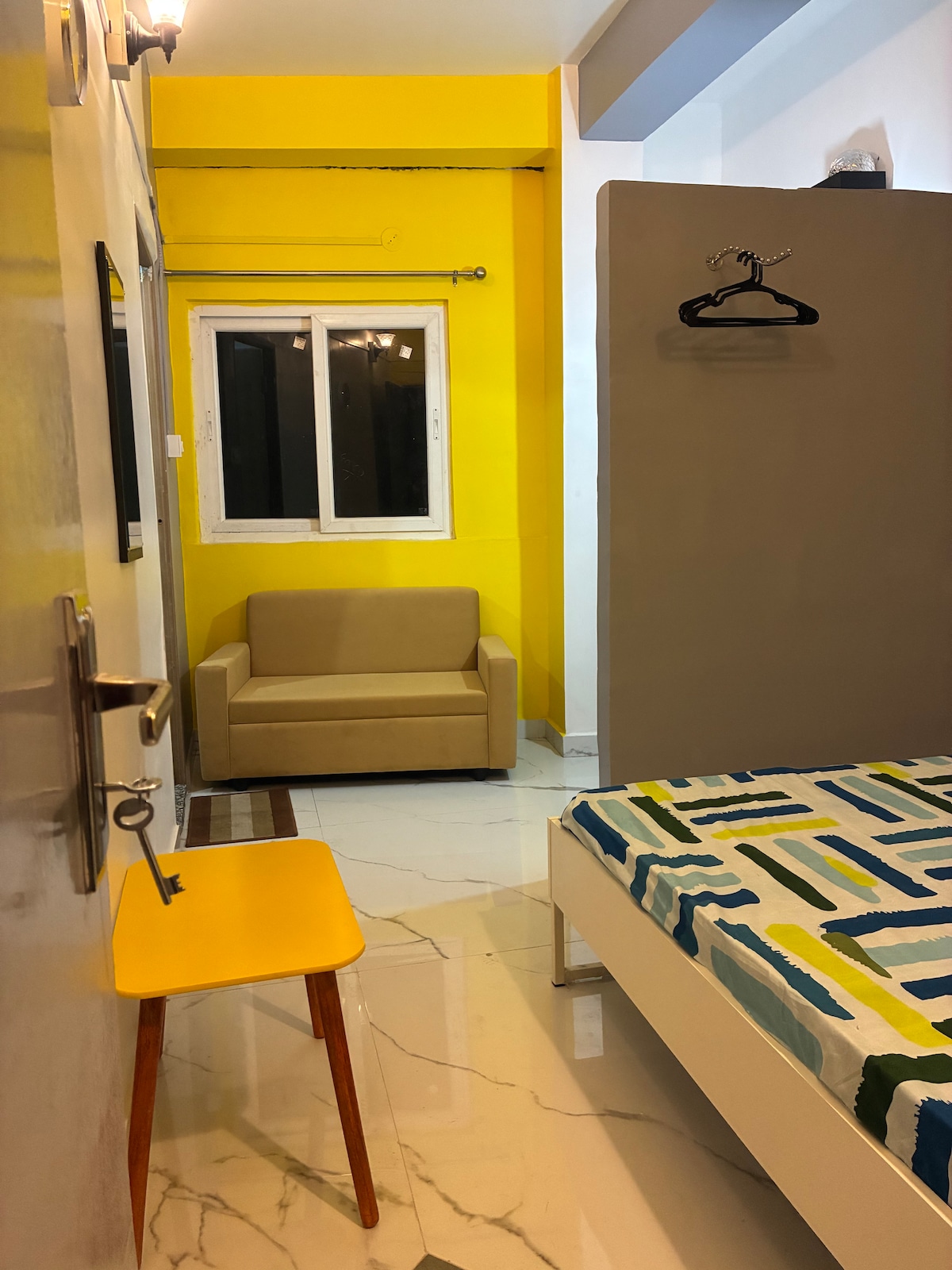 Un hébergement paisible, confortable et élégant avec une chambre spacieuse, un hall avec cuisine et une salle de bain attenante pour une famille, un couple ou un groupe de 4 à 5 personnes. Le séjour comprend tous les équipements modernes comme la télévision, le WiFi, le geyser pour un séjour parfait et accueillant ; que ce soit un court séjour privé ou un séjour de vacances plus long. La cuisine est bien équipée pour cuisiner des repas (livraison de nourriture en ligne à 15 minutes est également disponible). Situé à proximité de l'autoroute, il est facile d'entrer et de sortir sans tracas en évitant la circulation fatigante de la ville.