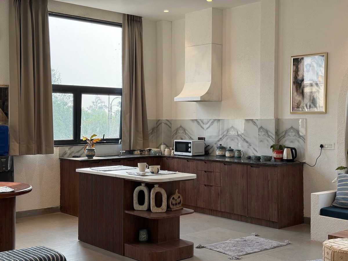 En entrant dans l'appartement, on a l'impression d'entrer dans un nouveau monde. Inspiré par l'architecture époustouflante de Santorin, l'ensemble de l'espace reflète le charme du design de style grec. Bien qu'il s'agisse d'un 1BHK avec 2 matelas supplémentaires, il est spacieux, ouvert et parfait pour les familles ou les rassemblements. Avec un énorme projecteur de 200 pouces et un aménagement ouvert sans murs de séparation, l'appartement semble vaste, comme un logement entier en lui-même. »