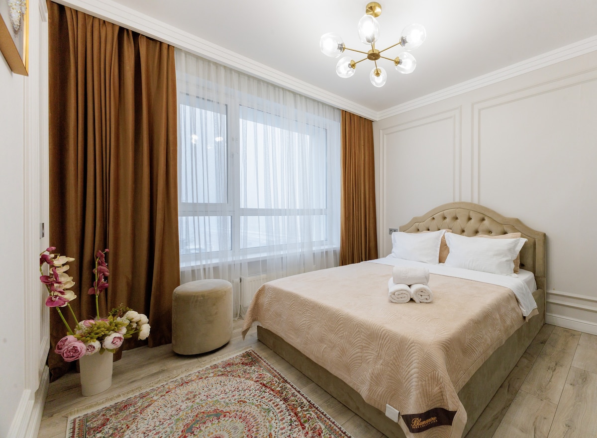 Soak in the Astana sun and skyline in style. Spend your day in a bright, modern apartment filled with art, comfort, and character—featuring an 8-meter-wide, full-height glass window that offers stunning views and magical sunsets. Perfect for remote work or a relaxing getaway, the space is fully equipped with everything you need: a dishwasher, bath, fully equipped kitchen, smart TV with Netflix and other streaming apps.