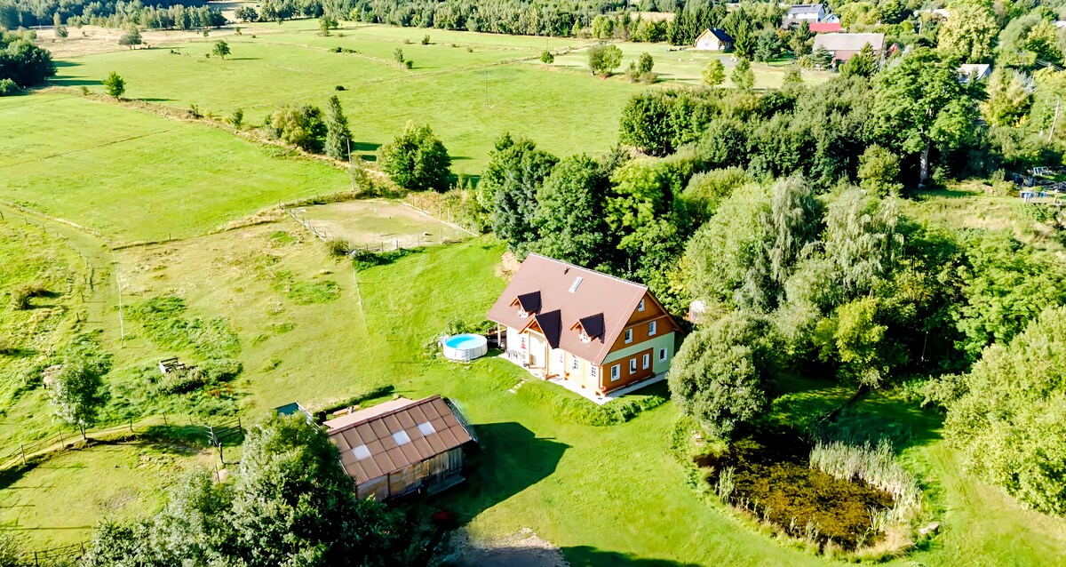 Bienvenue dans un endroit charmant pour 5 personnes - une maison atmosphérique. Détendez-vous dans une piscine privée, jacuzzi, sauna infrarouge. Passez du temps en famille ou entre amis avec une vraie cheminée, un barbecue partagé ou un feu de camp. Profitez d'un grand espace de loisirs qui garantit une intimité totale. Notre maison est située en plein cœur du parc paysager de la montagne, à côté du parc national des montagnes géantes (montagnes géantes/ Karpacz). Bienvenue dans un séjour unique au milieu de la nature !