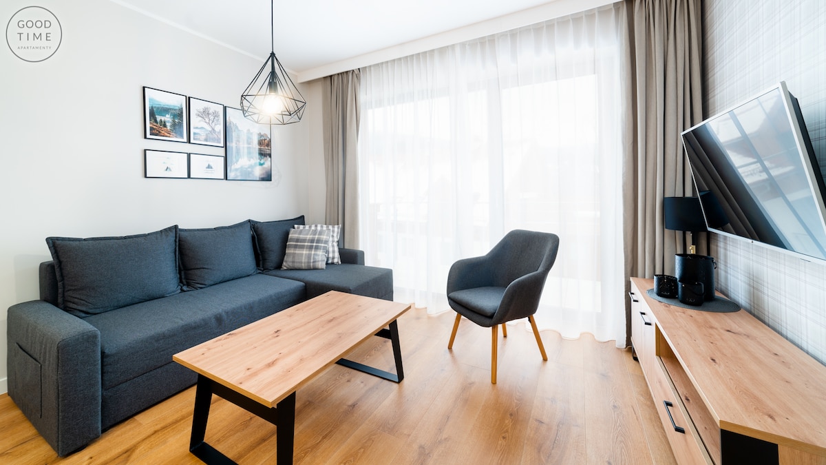 Funkcjonalny, dwupokojowy apartament zlokalizowany na pierwszym piętrze budynku, idealny dla czteroosobowej rodziny. Duży salon ze strefą kuchenną i jadalnianą, oddzielna sypialnia, łazienka i łaczący je przedpokój. Wyposażenie salonu stanowią: wygodny rozkładany narożnik, stół z czterema krzesłami, telewizor oraz aneks kuchenny. W sypialni znajdują się dwa łóżka pojedyncze oraz szafa. Łazienka z prysznicem i WC.