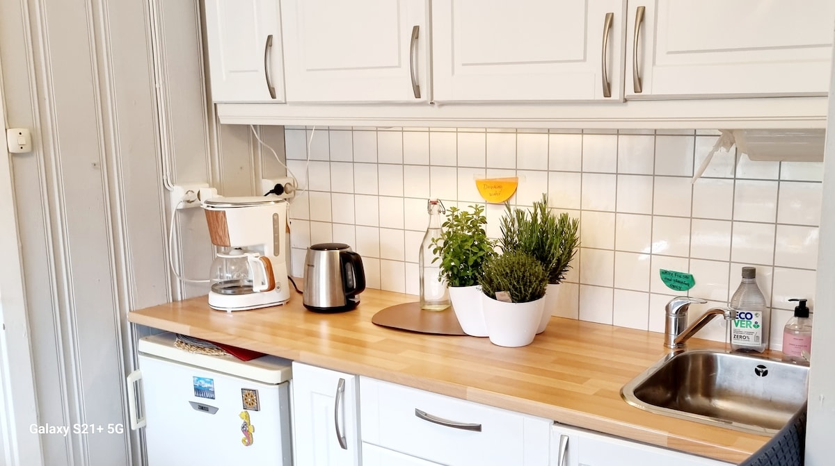 Appartement mansardé dans une maison ancienne dans la rue piétonne de Kopervik. Rénové en janvier-février 2022. L'appartement dispose d'un salon, d'une cuisine, d'une salle de bain, d'une buanderie, de deux petites chambres et d'une grande chambre avec un lit double, une armoire et un bureau avec une chaise de bureau et une bonne lumière. Épicerie, magasins et restaurants à proximité immédiate. Parking gratuit à proximité. À 2 minutes à pied de l'arrêt de bus