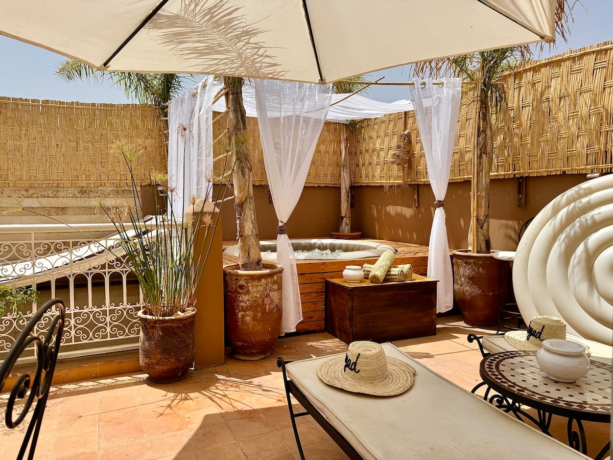 Niché au cœur de la Kasbah, à 2 min des Tombeaux Saadiens et 10 min de la place Jemaa el-Fna, notre riad de 4 suites allie charme et confort. Profitez d’une piscine privée, d’un bassin-douche sur la terrasse et d’un rooftop magique pour vous détendre après vos excursions. Le petit-déjeuner est inclus et Ghizlane se fera un plaisir de vous initier aux saveurs de Marrakech. Notre conciergerie est à votre service pour rendre votre séjour inoubliable.