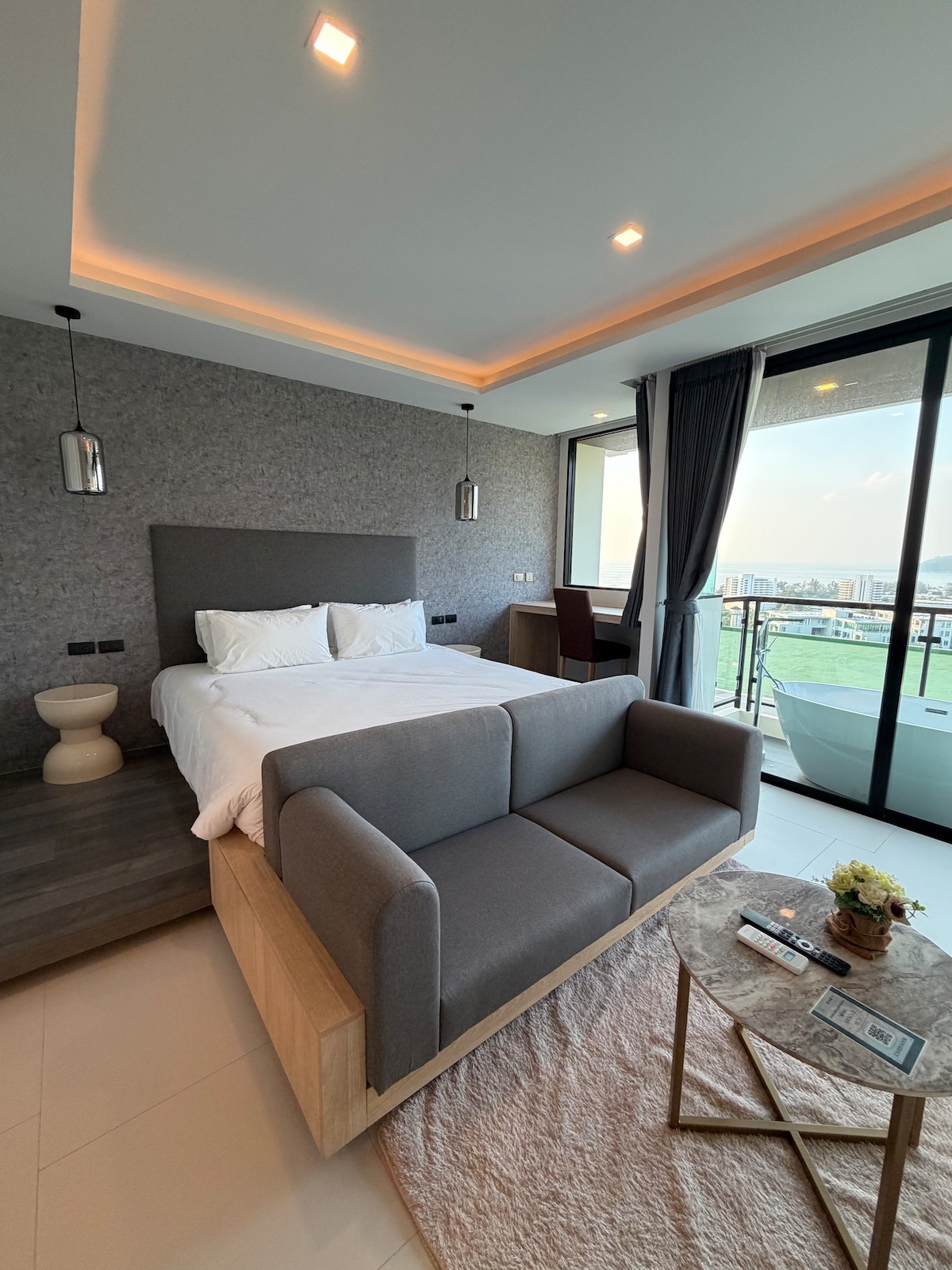 Bienvenue à Utopia Karon (condominium de luxe avec vue sur la mer) ---------- Un tout nouveau condominium construit en 2024, situé à Karon, une zone touristique populaire de Phuket, avec 1 chambre et 1 salon, 35 mètres carrés d'espace exquis - balcon avec vue sur la mer + baignoire immersive. Points forts de la maison : à 7 minutes à pied de la plage de Karon!Du sable blanc et de la mer bleue, des vues sur le coucher du soleil sont toutes devant vous, entourées de restaurants, de dépanneurs, de marchés nocturnes, à la fois calmes et pratiques. Balcon privé avec vue sur la mer + baignoire romantique sur le balcon. Espace de 35 m² intelligemment conçu, chambre directement reliée au balcon panoramique, vue sur la mer et la montagne, mer et ciel bleus pendant la journée, profitez de la beauté originale de la forêt sauvage. Piscine à débordement avec vue sur la montagne, expérience immersive à 360 degrés de la vie de vacances de luxe à Phuket Cuisine entièrement équipée + maison intelligente, cuisine moderne entièrement équipée (cuisinière à induction, micro-ondes, réfrigérateur, ustensiles de cuisine), chambre avec télévision intelligente, Wi-Fi haut débit, climatisation. La communauté hôtelière est entièrement équipée : il y a deux grandes piscines sur le toit, une salle de sport, un restaurant, un service de voiturier, un stationnement gratuit. Salle de bain : Espaces humides et secs séparés, de l'eau minérale et des articles de toilette jetables seront fournis à l'arrivée. Idéal pour des vacances reposantes, des séjours courte durée et le télétravail.