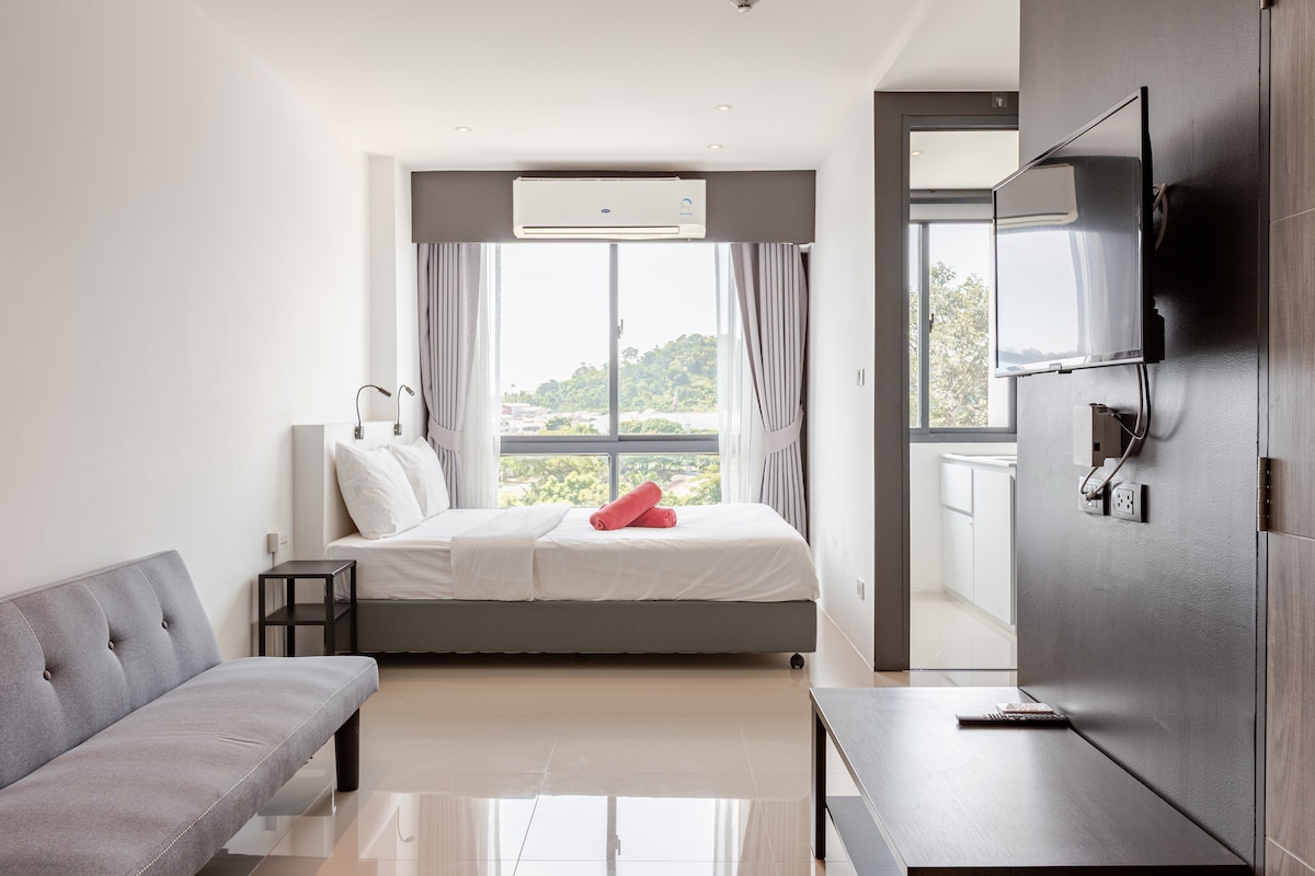 Magnifique appartement studio d'angle au dernier étage avec beaucoup de lumière du jour et une vue dégagée sur la montagne. Doté d'une élégante cuisinette, d'un lit queen-size, d'un canapé-lit (déplié 120 cm x 180 cm), d'une salle de bain complète, d'une connexion Wi-Fi rapide et de la climatisation, ce studio entièrement équipé est parfait pour les voyageurs en solo ou un petit groupe jusqu'à 3 personnes. Niché dans le centre de Phuket, c'est un excellent point de départ pour explorer n'importe où sur l'île en voiture ou en moto.