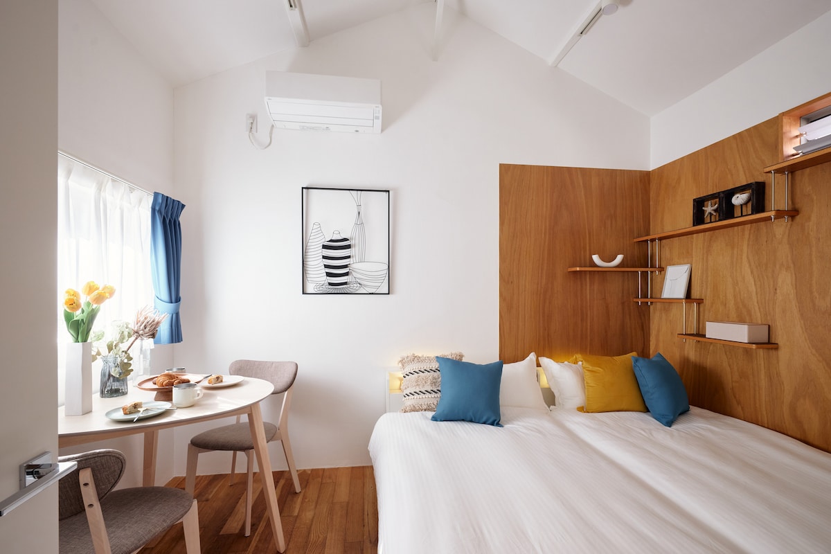 Profitez d'un séjour privé dans un logement avec permis à côté d'un dépanneur ouvert 24 h/24. À seulement 30 minutes en train de la gare de Tokyo. Vélos gratuits, Wi-Fi, Amazon TV et un taxi gratuit depuis la gare de Kawaguchi le jour de l'arrivée. Ce préfabriqué populaire n'a pas de cuisine, vous mangerez donc probablement au restaurant ou vous utiliserez des plats préparés. La chambre est simple, avec deux lits et deux petits bureaux, sans équipements supplémentaires. Le soir, détendez-vous avec votre boisson préférée.