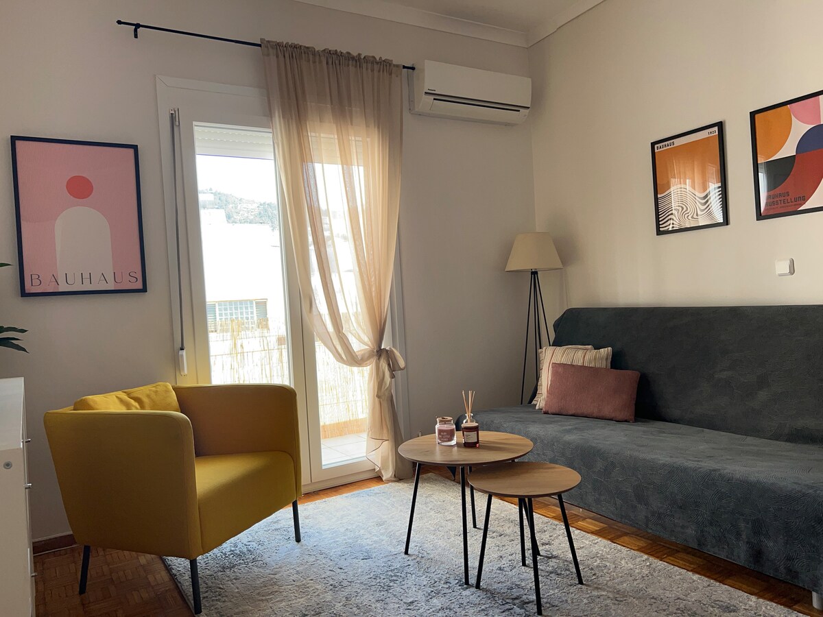 Appartement moderne au 4e étage dans le centre de Kavala, à 100 mètres de la route côtière, du port et du marché central de la ville. Il dispose de 2 chambres, d'un lave-linge et d'un sèche-linge, d'une télévision connectée avec Netflix, d'un café expresso, frappé, Nespresso, français et grec. Il dispose également de tous les ustensiles de cuisine nécessaires pour cuisiner.