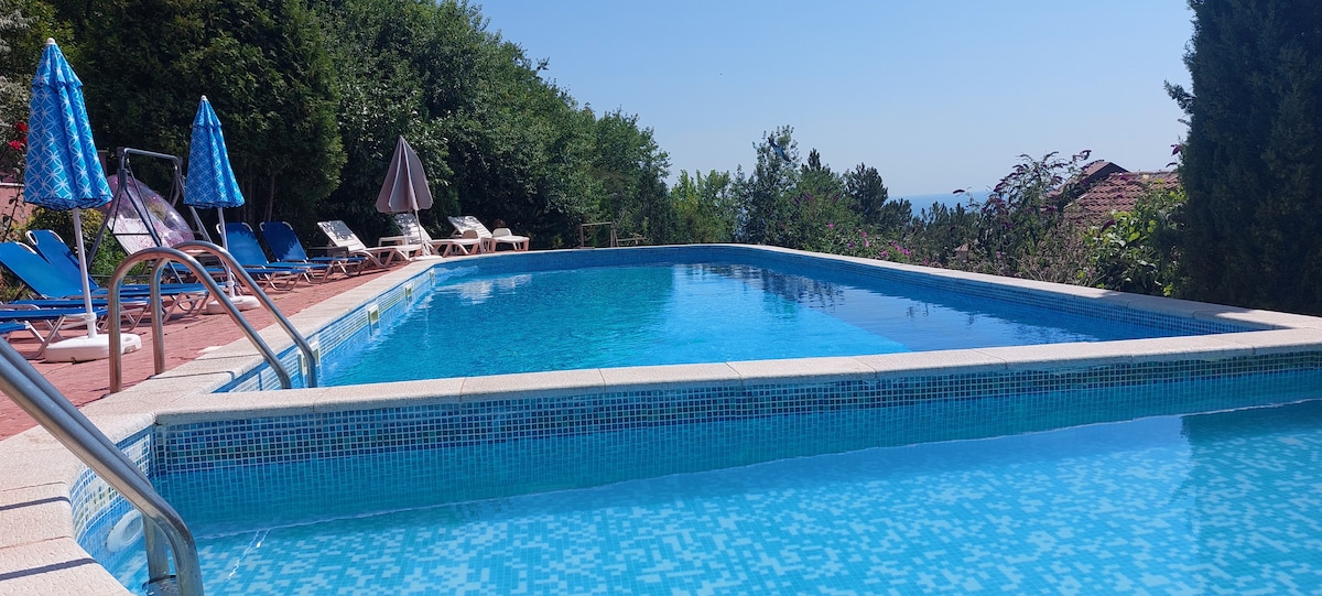 Vous apprécierez mon logement car c'est une belle villa confortable avec vue sur la mer, piscine chauffée profonde et jacuzzi, sauna, cour verte, beau jardin, aire de jeux extérieure pour enfants, zone de barbecue avec mobilier !Il y a une cuisine de style italien (machine à expresso, réfrigérateur-congélateur, grille-pain, bouilloires, micro-ondes, four/plaques de cuisson, lave-linge, lave-vaisselle est), de hauts plafonds, des lits et des chambres super king size, la climatisation, des fenêtres de style français. Mon logement est parfait pour les couples, les familles (avec enfants) et les groupes.