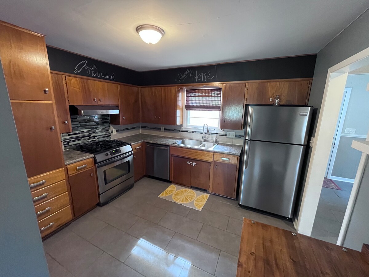 Votre famille sera proche de tout lorsque vous séjournerez dans ce logement central. Le Vieux Moulin et le parc de la ville sont de l'autre côté de la rue et la piscine de la ville est à distance de marche, à seulement deux pâtés de maisons! Profitez de la cour arrière clôturée, de la terrasse et de l'aire de jeux pour les enfants. Cette maison dispose de deux allées et d'un garage attenant à deux voitures. Notre objectif est de vous fournir un logement confortable afin que vous puissiez profiter de tous les équipements de notre petite ville.