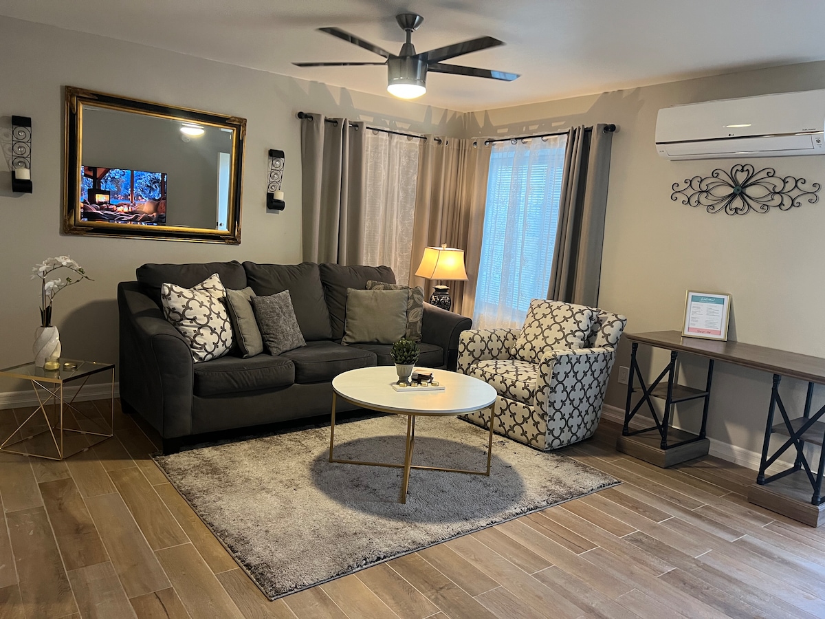 Cette maison propre et récemment rénovée de 2 chambres et 1,5 salle de bain est parfaite pour votre prochain séjour. La maison est juste à côté de l'autoroute 198. À 5 minutes de toutes les brasseries, boutiques et restaurants locaux que le centre-ville de Visalia a à offrir. À seulement 45 minutes du parc national de Sequoia. Il s'agit de l'une des 2 maisons de la propriété avec votre propre allée pour garer jusqu'à 3 véhicules. Les chambres disposent d'un lit Queen Size, d'un lit double gigogne et d'un canapé-lit. Chambre principale équipée d'une télévision de 50' et 65' dans le séjour.