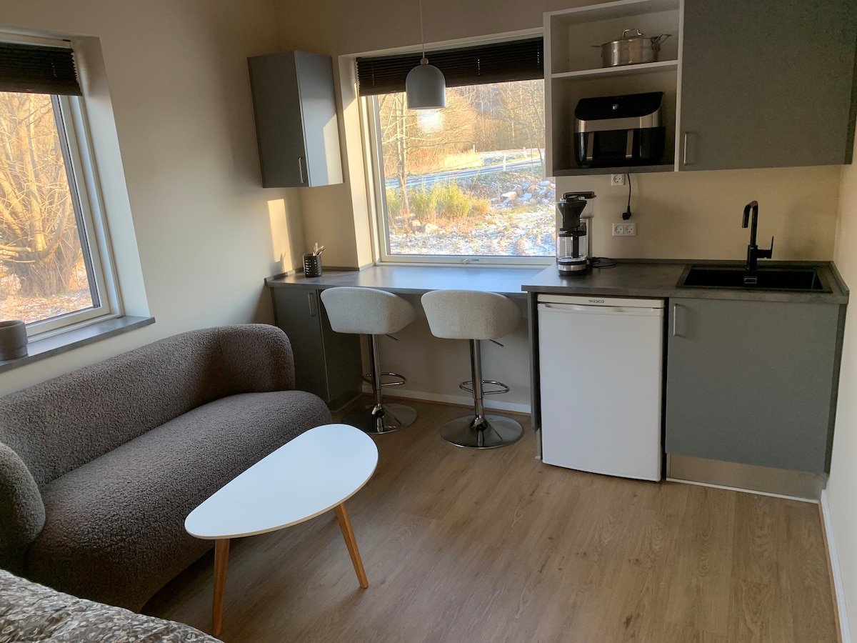 Profitez du confort et de la tranquillité dans un appartement lumineux et agréable d'environ 50 m2 sous le plafond dans une grange convertie. 1 d'un total de 2 appartements. Construit en 2021. 2 chambres, salon avec canapé-lit, cuisine complète et salle de bain privée. Accès à une piscine partagée. Idyllique à la campagne, mais à seulement 2,5 km de bons magasins, ainsi qu'à environ 10 minutes en voiture d'une fantastique plage de sable adaptée aux enfants. Chiens, chats et chevaux. Le propriétaire vit sur le terrain, mais pour la deuxième longue. Forfait Fibernet et télévision. NOUVEAU 2025 : Salle de jeux avec baby-foot, tennis de table et console de jeux rétro.