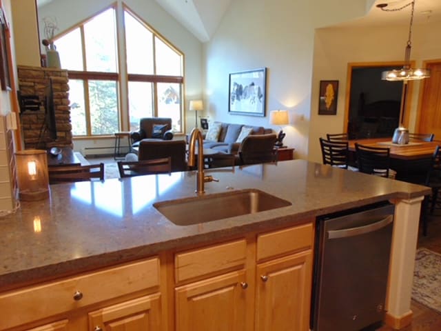 Bienvenue dans notre appartement lumineux d'une chambre au cœur de River Run Village (Keystone Mountain) ! Évitez les navettes pour les remontées mécaniques car cet appartement est à 3 minutes à pied de la télécabine ! Cet appartement peut accueillir quatre personnes et dispose d'une chambre privée avec lit King Size ainsi que d'une unité rénovée avec des comptoirs en granit. Profitez de votre boisson préférée tout en profitant du soleil et de vues spectaculaires sur les pistes, que ce soit à l'intérieur chauffé par le feu ou à l'extérieur sur votre propre balcon privé.