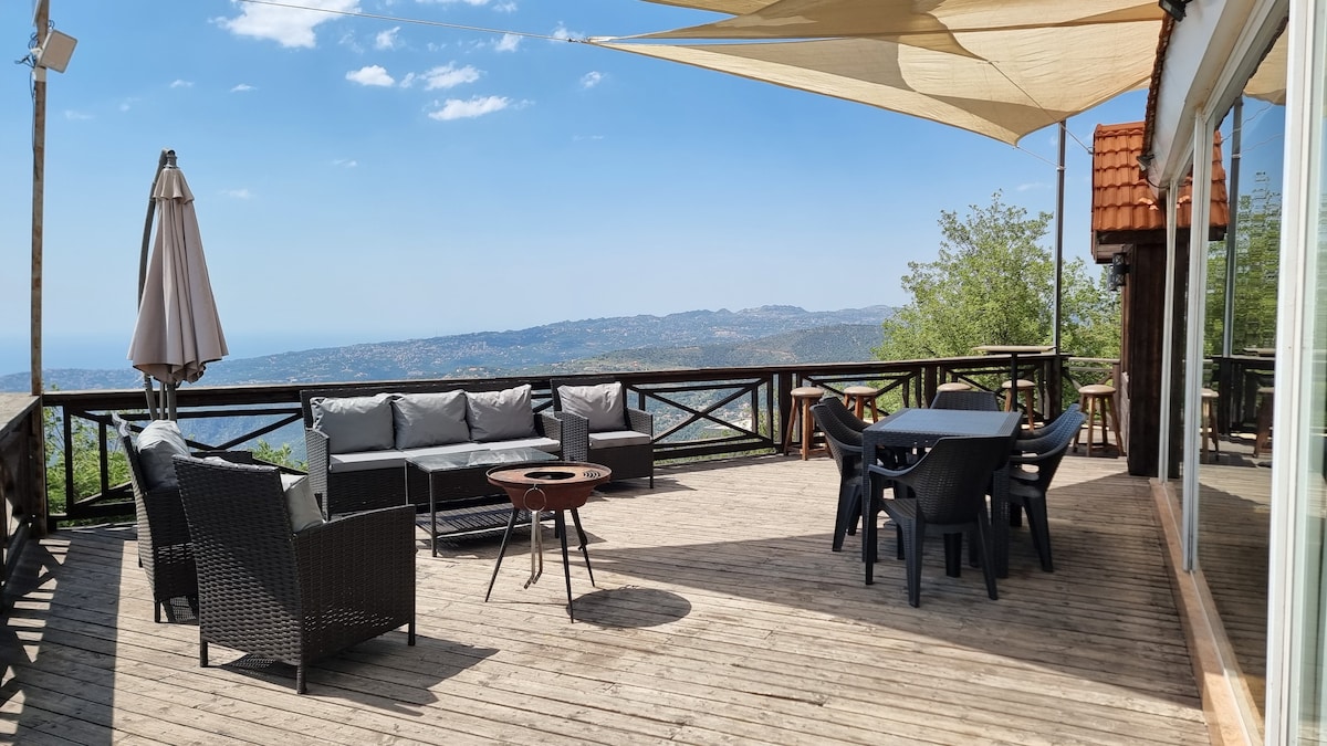 Toutes les réservations comprennent le concierge, l'électricité 24h/24, la planification du voyage et le stationnement gratuit. ★ « Belle maison en rondins avec une vue imprenable ! Plusieurs sentiers de randonnée dans la région, à quelques pas. Hautement recommandé. Villa en duplex de 140 m² avec grande terrasse et vue à couper le souffle. ☞ Aucune règle de départ Électricité et chauffage☞ 24 h/24, 7 j/7 ☞ Lit bébé et chaise haute gratuits sur demande À ☞ 5 minutes en voiture de la station de ski de Mzaar Télévision ☞ HD avec Netflix ☞ Barbecue avec coin salon