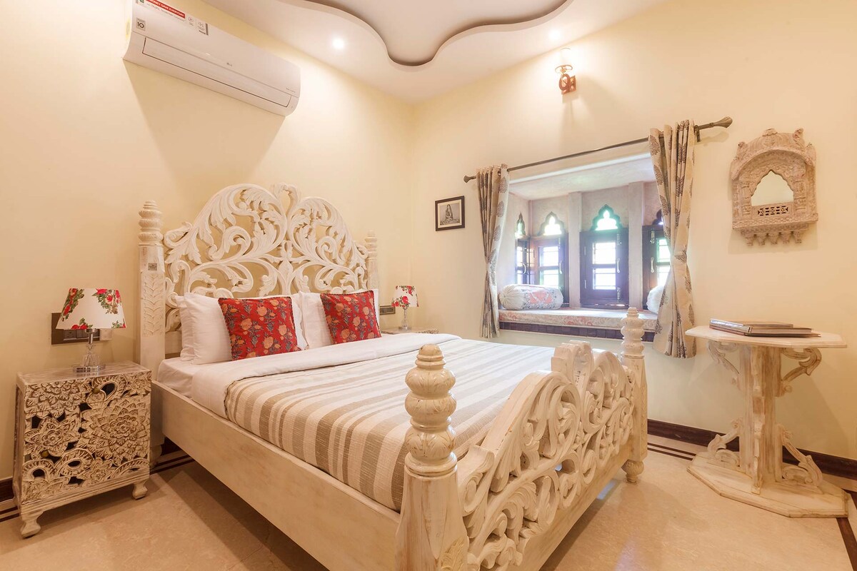 Découvrez The Royale Haveli By Madvik Retreat in Rajasthan ! Laissez-vous emporter par la magie du patrimoine et de la culture dorés de Jodhpur. Le haveli est un séjour de 3 chambres avec toutes les commodités et le confort modernes. Vous pouvez profiter du ciel ouvert près de la piscine ou vous détendre près de la zone du jardin à la voix des oiseaux dans la distance. Beaucoup d'oiseaux et de paons ont été repérés sur la terrasse et le jardin de ce haveli. Réservez votre séjour et gâtez-vous avec la délicieuse cuisine et l'hospitalité incroyable de notre personnel