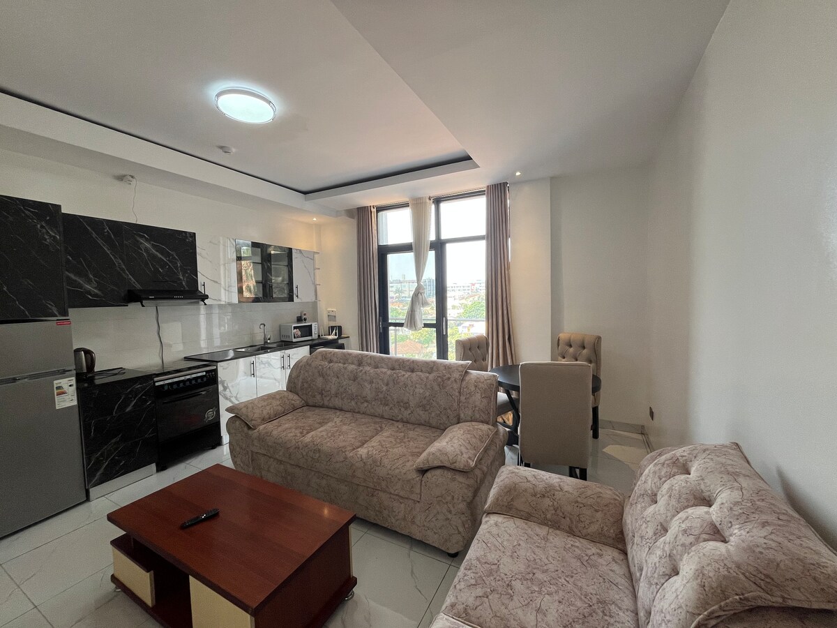 Our stylish 2 Bedroom apartment offers a fine blend between luxury and comfort. Located in Masaka Close to DP World, the space features a Large open plan living room with an equally Large patio, an all ensuite bedroom and a guest's bedroom with a common bathroom. Other amenities that Guests can access include a gym and sauna on the ground floor, and a rooftop area to relax. The space is also very accessible and close to a tarmac road. BOOK NOW! - to enjoy our tranquil hospitality.