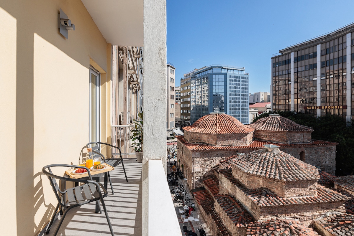Appartement, au cœur du centre-ville historique, en face de l'église Saint-Démétrius, offre une expérience de vie confortable et pratique dans un quartier animé et recherché et est parfait pour les particuliers, les couples ou les petites familles à la recherche d'un espace de vie confortable pour visiter la ville. L'appartement offre une belle vue panoramique sur la ville et tout le golfe de Thessalonique depuis la terrasse à l'avant, tandis que de l'arrière vers la ville haute et les anciens murs.