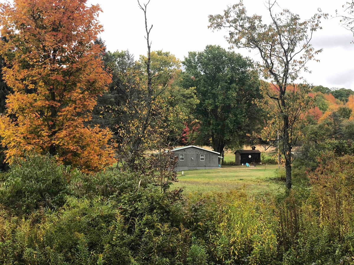 Cabane familiale construite sur un domaine rural de 30 acres, juste à l'extérieur du village de villégiature d'Ellicottville, ouvert toute l'année. Parfait pour les amoureux de la nature et les amateurs de plein air, le chalet dispose de toutes les commodités, semblable à une petite maison. Niché près des jardins et entouré de collines vallonnées tranquilles. Profitez du petit-déjeuner livré à votre porte, ou réservez une randonnée guidée avec le propriétaire du domaine et découvrez les plantes et les fleurs médicinales, la topographie du terrain et un pique-nique frais à la ferme sur la péninsule de notre lac.
