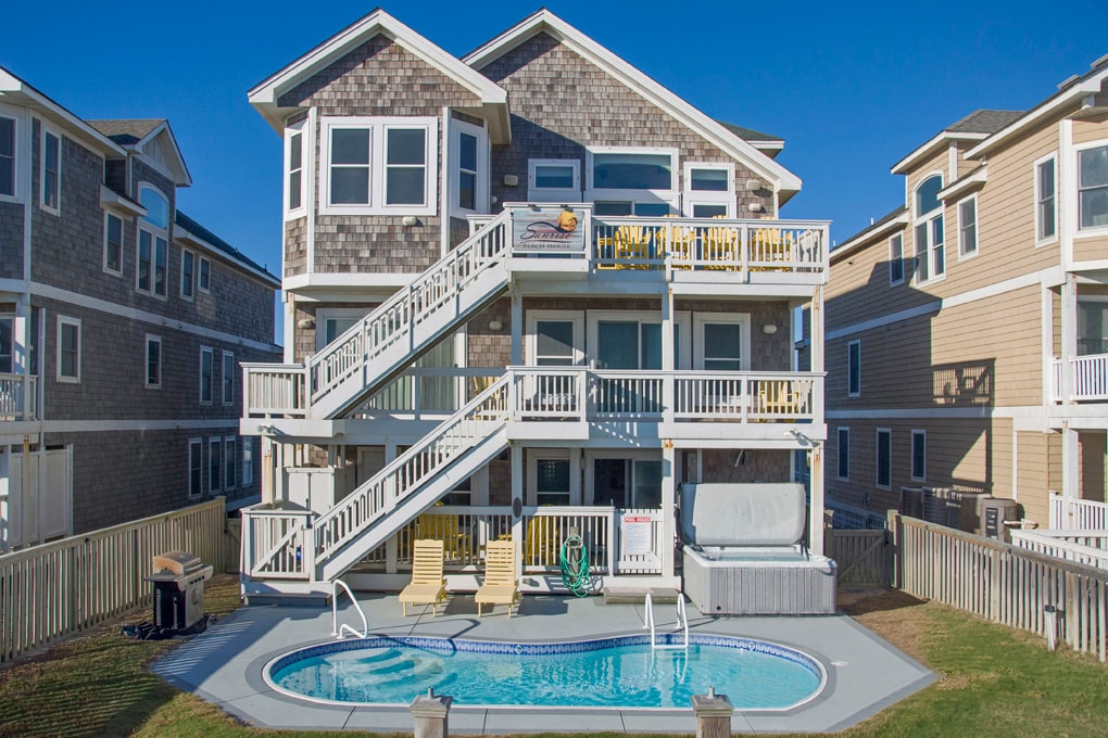 Sunrise Surf House is right across the street from the ocean, with great views! The access to the ocean is only 2 houses away. Our large pool will have free heat starting the end of April -mid October. . We also have a 6 person hot tub on the pool deck, closed Jan/Feb. Family and dog friendly! (See House Rules). We are centrally located 3 houses away from Southern Shores Crossing Shopping Center, where you can walk to dining, pizza, ice cream, shopping, and even an escape room.