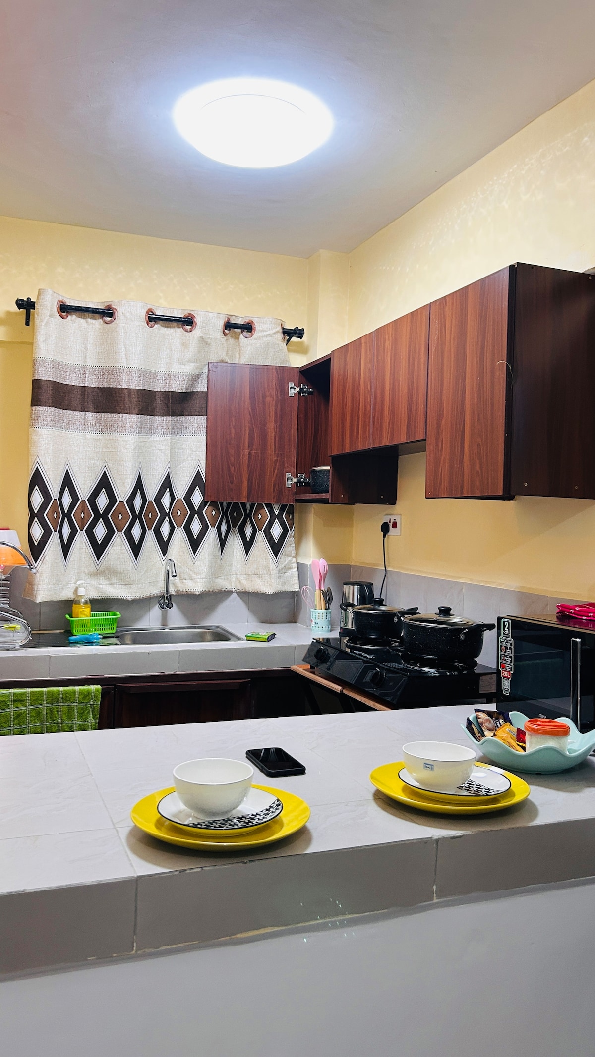 Aryana Furnished Apartment dispose d'une maisonnette moderne de 4 chambres entièrement meublée située dans un village paisible dans la ville de Kisumu au bord du lac. Nous aimons offrir une hospitalité à tous les types de voyageurs, des voyageurs en vacances à la famille avec des enfants. - Nous disposons d'un joli grand salon climatisé - Grande cuisine moderne semi-ouverte - Coin repas séparé avec tabourets de style restaurant - Élégants toilettes impeccables - Grand parking