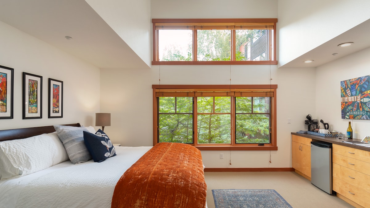 Bienvenue au Studio Katsura, l'un des quatre studios de la communauté Vineyard Lane Condo. C'est l'endroit idéal pour commencer à explorer la magnifique île de Bainbridge. À distance de marche des restaurants gastronomiques, des commerces et des sentiers au bord de l'eau de Winslow, vous apprécierez ce studio confortablement aménagé avec lit King Size, cheminée, télévision connectée à écran plat, mini-réfrigérateur, café et thé Keurig. Idéal pour ceux qui recherchent une escapade paisible.
