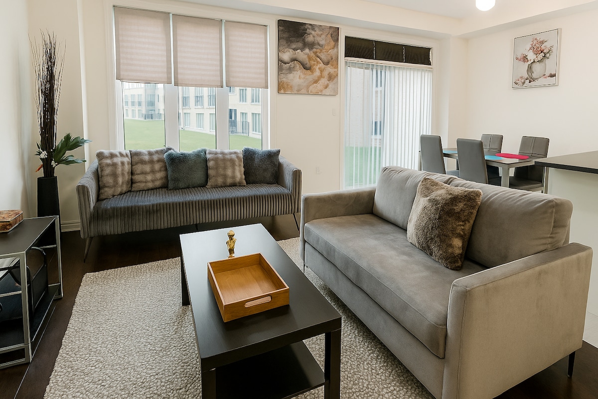 Restez dans une maison de ville lumineuse et moderne près de Canada's Wonderland et de lieux de mariage populaires. À quelques minutes du village de Kleinburg, de la galerie d'art McMichael et des attractions de Vaughan, cette retraite offre confort et commodité, idéale pour les familles, les couples et les professionnels. ✔ 2 chambres + 1,5 salle de bain ✔ WiFi haut débit Stationnement ✔ gratuit dans le garage ✔ Cuisine, salle à manger et salon ✔ Près des lieux de mariage, des magasins et des restaurants À ✔ 11 minutes de l'aéroport Pearson Quartier calme – pas de partys ni d'événements autorisés.