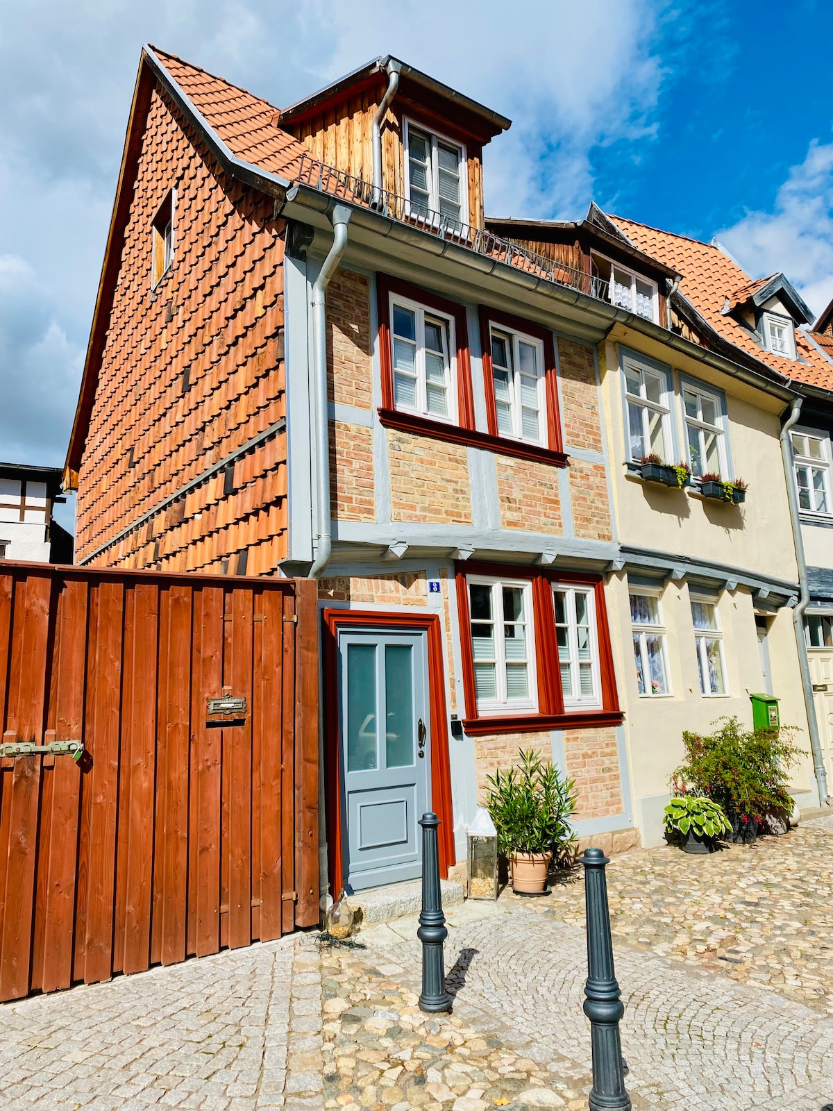Bienvenue à Quedlinburg, patrimoine mondial de l'UNESCO, ce charmant appartement non-fumeur est à louer à distance de marche du marché, du château et des différentes salles de conférence accessibles à pied. L'appartement au rez de chaussée a été entièrement rénové au début de 2021 exclusivement avec des matériaux organiques, tels que l'argile, le vrai parquet et les peintures murales sur une base naturelle. Au total, l'espace de vie est divisé en environ 55 m ² avec 2 pièces. 100 Mbit/s WLAN - travail mobile prêt