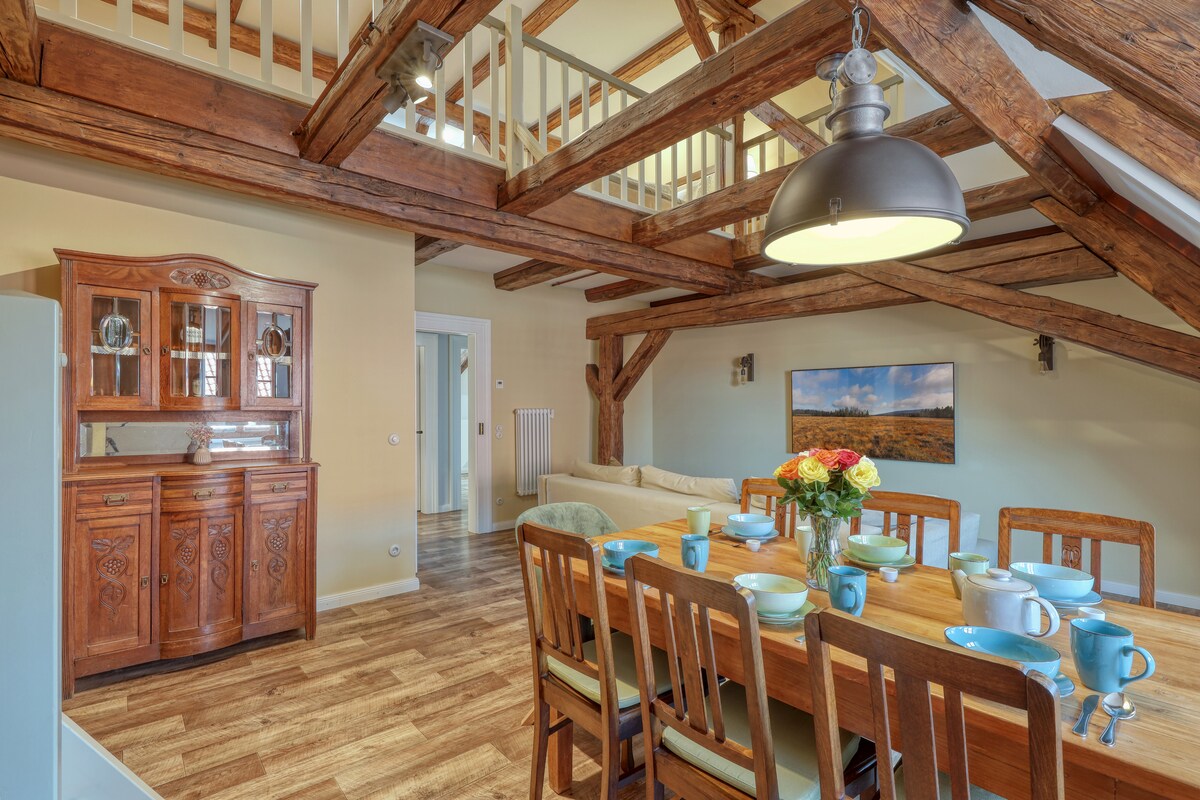 Plonge dans un monde du passé. La Gänsetrappe est un monument unique vieux de 335 ans dans la vieille ville de Ballenstedt. La maison se trouve sur un terrain d'environ 1000 m² au bout d'une impasse. L'originalité a été préservée autant que possible et soigneusement combinée avec les exigences contemporaines d'un logement de vacances confortable. Dans le magazine Wohnen im Landhausstil numéro 01/2020, tu trouveras de plus amples informations ou contacte-nous simplement.