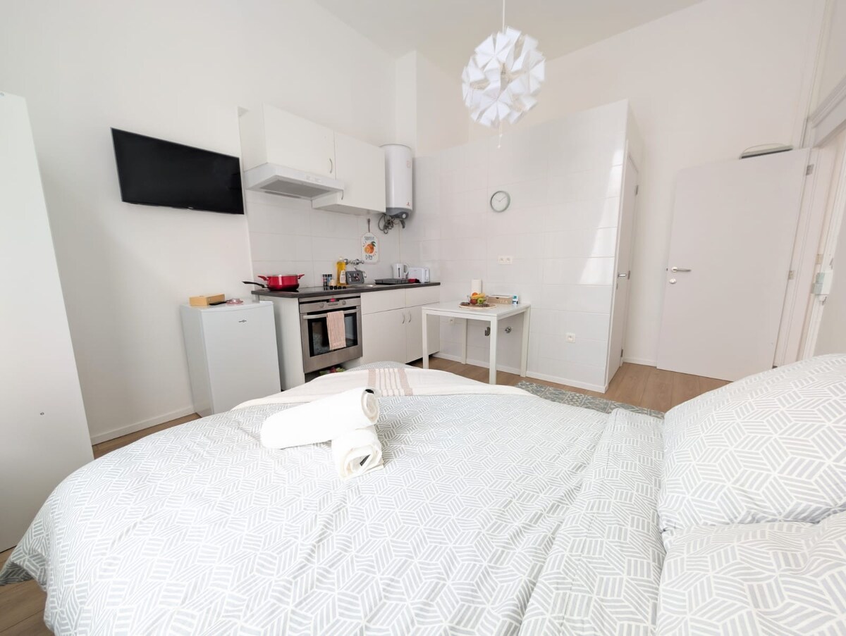 Bienvenue dans cette suite moderne entièrement rénovée, pensée pour offrir un séjour calme, confortable et pratique à Bruxelles. Détendez-vous dans un superbe lit avec led intégré. Savourez un dîner dans la cuisine toute équipée et profitez d’une salle de bain lumineuse à douche italienne. Wi-Fi, TV avec chaînes belges et espace repas complètent ce cocon raffiné. Idéal pour un séjour romantique ou professionnel, chaque détail est pensé pour votre confort et votre plaisir.