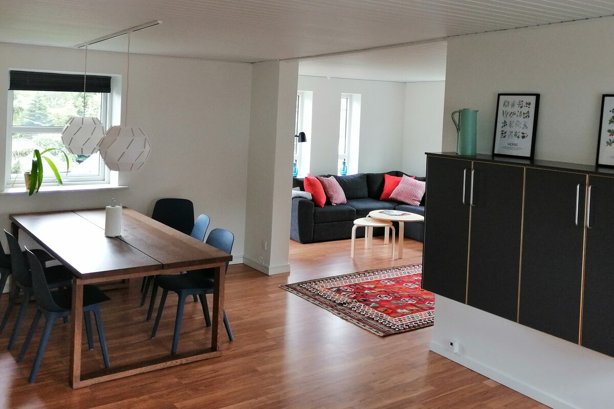 This 1. Floor apartment is renovated in 2020 and there are 2 sleeping rooms and a loft with a big window and mattresses, where the kids love to stay. There is a lovely view to the sea which is only 75 meter away and LEGOLAND is under an hour away. The beach is very child friendly.