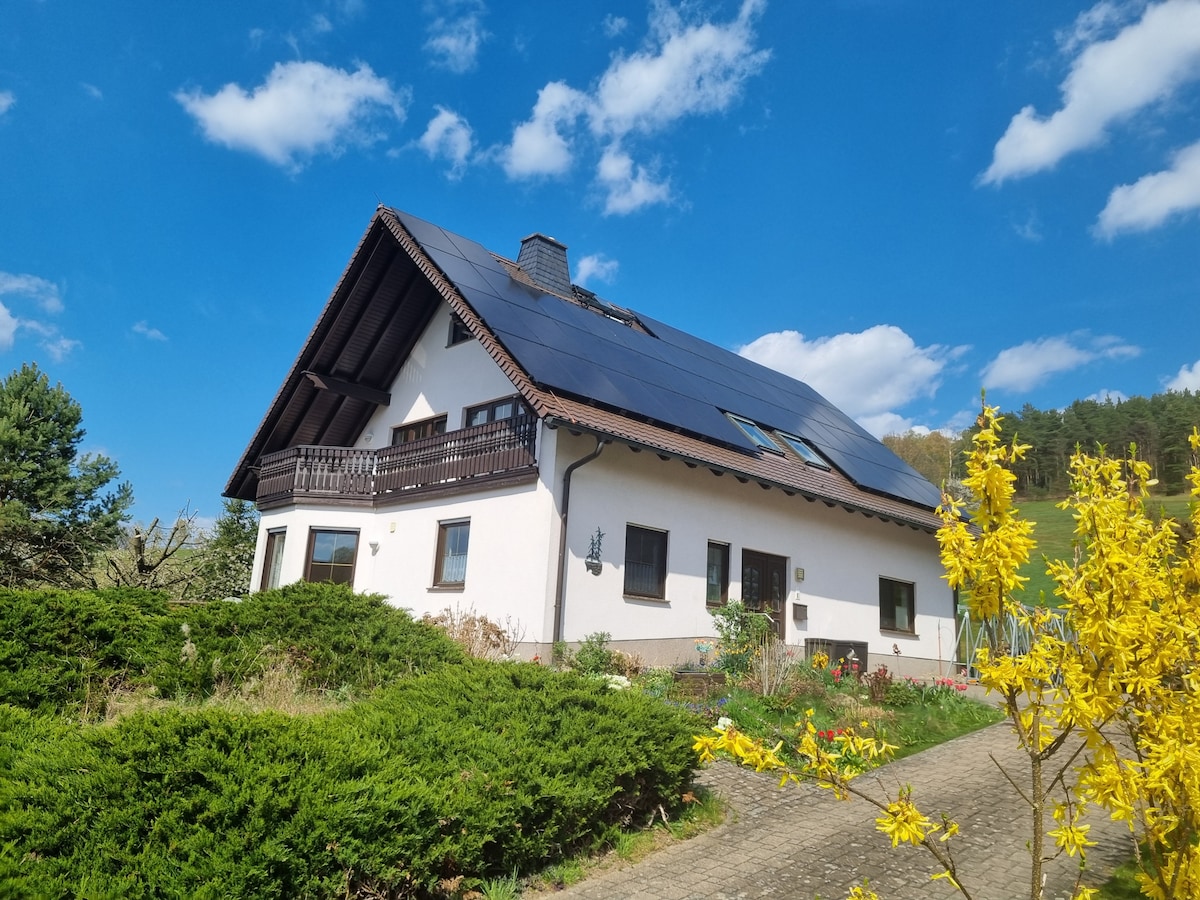 Détends-toi avec toute la famille dans ce logement paisible. Idéal pour 5 personnes maximum 6 Ton chien est le bienvenu. Les enfants ont beaucoup d'espace. Randonnée- escalade-vélo- détente-travail..... 3 km piscine extérieure naturelle, zone d'escalade, grotte de Bennohöhle, labyrinthe rocheux, forteresse de Königstein, parc de loisirs de l'Elbe Cuisine entièrement équipée.3 chambres à coucher séparées. Barbecue, salon extérieur. Un scooter + 2 vélos simples. Maison de jeu pour enfants. Pelouse et fruits bio de notre propre culture :-)