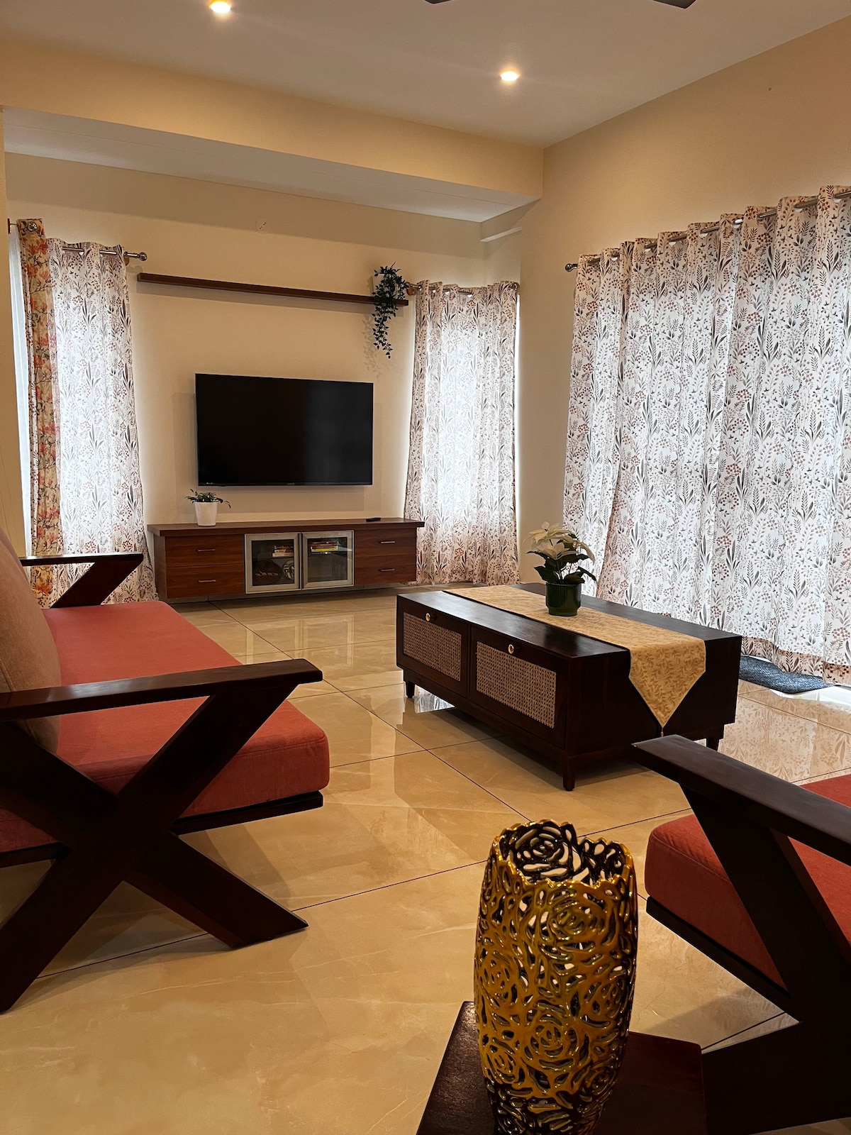 Bienvenue dans ma maison entièrement meublée de 2 lits et 2 salles de bain dans le nord de Bangalore, idéale pour jusqu'à 6 personnes. Les deux chambres ont des lits doubles, et le salon comprend un canapé-lit, une télévision LED, un onduleur UPS et des meubles Urban Ladder. La cuisine est entièrement équipée et comprend un réfrigérateur LG, un grille-pain, une plaque à induction et tous les ustensiles essentiels. Le prix de base est pour 2 voyageurs, avec des frais supplémentaires pour les voyageurs supplémentaires (jusqu'à 6). Cet Airbnb confortable et économique offre un confort sans l'extravagance d'un hôtel de luxe.