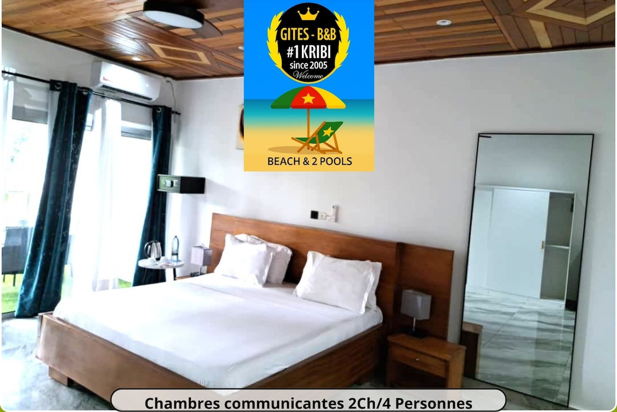 Chambres Communicantes – Lobé, Ntem, Kienje & Dja Idéales pour familles ou amis, nos chambres côte à côte reliées par une porte intérieure offrent confort et intimité à deux pas de la plage. Climatisées, équipées de lits doubles et simples, salle(s) de bain avec douche chaude, TV, Wi-Fi gratuit. Profitez de l’accès piscine, salle de sport et restaurant Au Plaisir du Goût. Un choix pratique et convivial au cœur de Kribi.